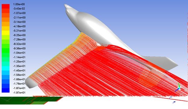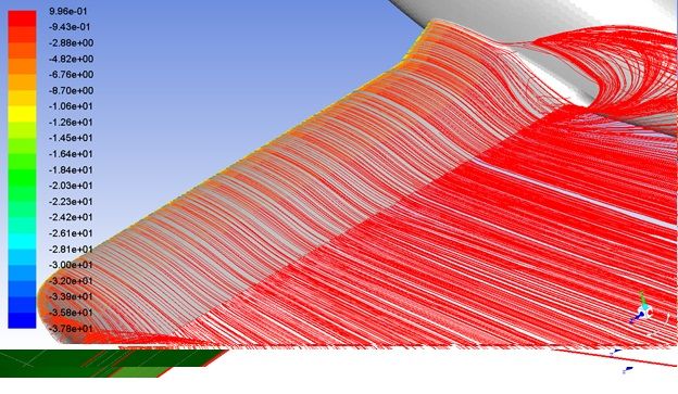 Рис. 16. Крыло 18–14, крутка –2°, скорость 300 км/ч, угол атаки 20°. Отрыв в бортовых сечениях попадает на оперение и приводит к «клевку» носом.