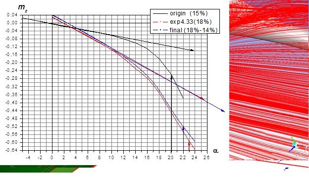 Для нового крыла производная коэффициента момента на пикирование резко увеличивается (в 2,7 раза) при [ch945]=17°, за 5° до критического угла атаки и за 7° до появления отрыва в средних сечениях крыла.