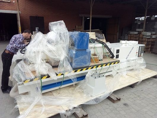 Получили 4-х координатный станок с полем фрезерования 1500*2500*600 с функцией автоматической смены инструмента на 8 позиций и привязки нуля инструмента.  😱 Зашел в цех, как там и был. :🙂 Ширина станка 2200мм, длина 4700мм, а ширина ворот 2210мм ;D