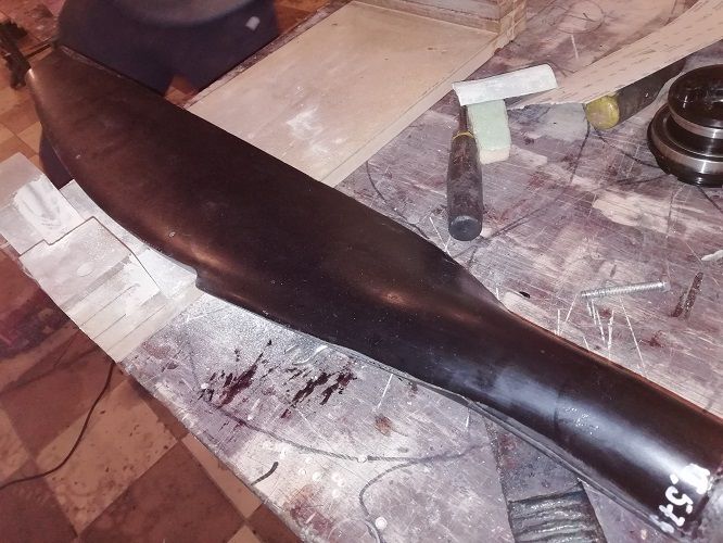 Вытащили четвертую лопасть и заложили следующую. Вес 579г и еще добавится 60г полиуретановой оковки. Сверху покрыта 100г эпоксидным матричным гелькоутом. который наносится в матрицу первыми 2-мя слоями . Все слоя ткани чередуются под 45* и 90 * по очереди и все вырезаны на лазере по программе