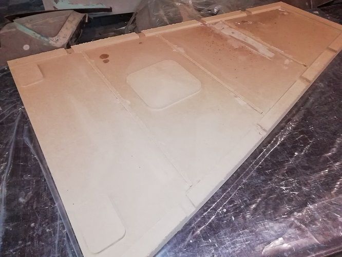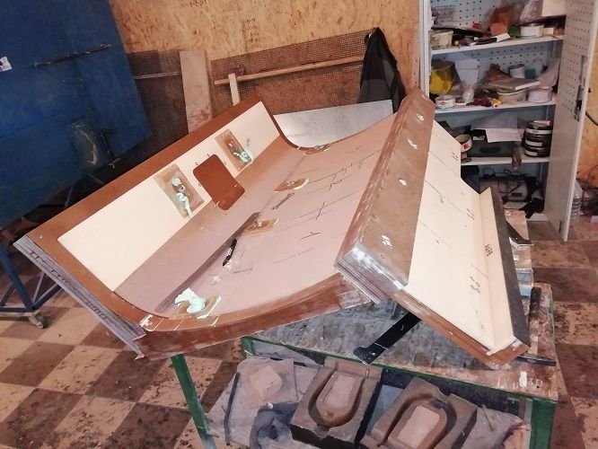 Отфрезеровали матрицу пола багажнока из МДФ.  и матрицу второго шпангоута из модельной плиты. Для экономии материала в средину матрицы вписалась матрица льчка пола багажника. Модельная плита, конечно, очень дорогая, :'(  но после фрезеровки ее немного пошкурить, отполировать и можно натирать разделителем перед формовкой. Матрицу из МДФ еще придется несколько дней доводить до ума, пропитывать смолой, шлифовать, шпаклевать и т.д. А это кусок работы и то же деньги. Поэтому для себя еще не поняли, как лучше.
