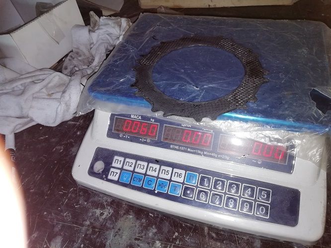 Изготовили первый опытный диск из угля. Вес , конечно, золотой   :~)  60г, вместо 360г, металлического. Но надежд на хороший результат практически нет.  Может удастся прикинуть коэфициент сцепления или еще чего нибудь. Но при том, что на улице сегодня -10С, и ВПП в снегу, может и хватит на несколько посадок. Сегодня попробуем.