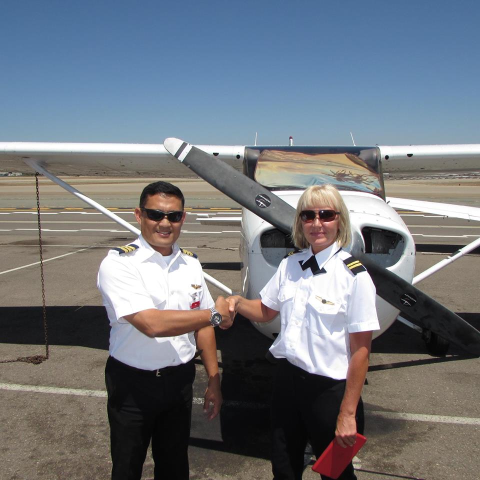 Правая рука Аллы лежит на секторе управления двигателем, левая на штурвале, взгляд устремлён вперёд.