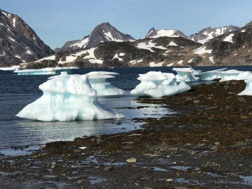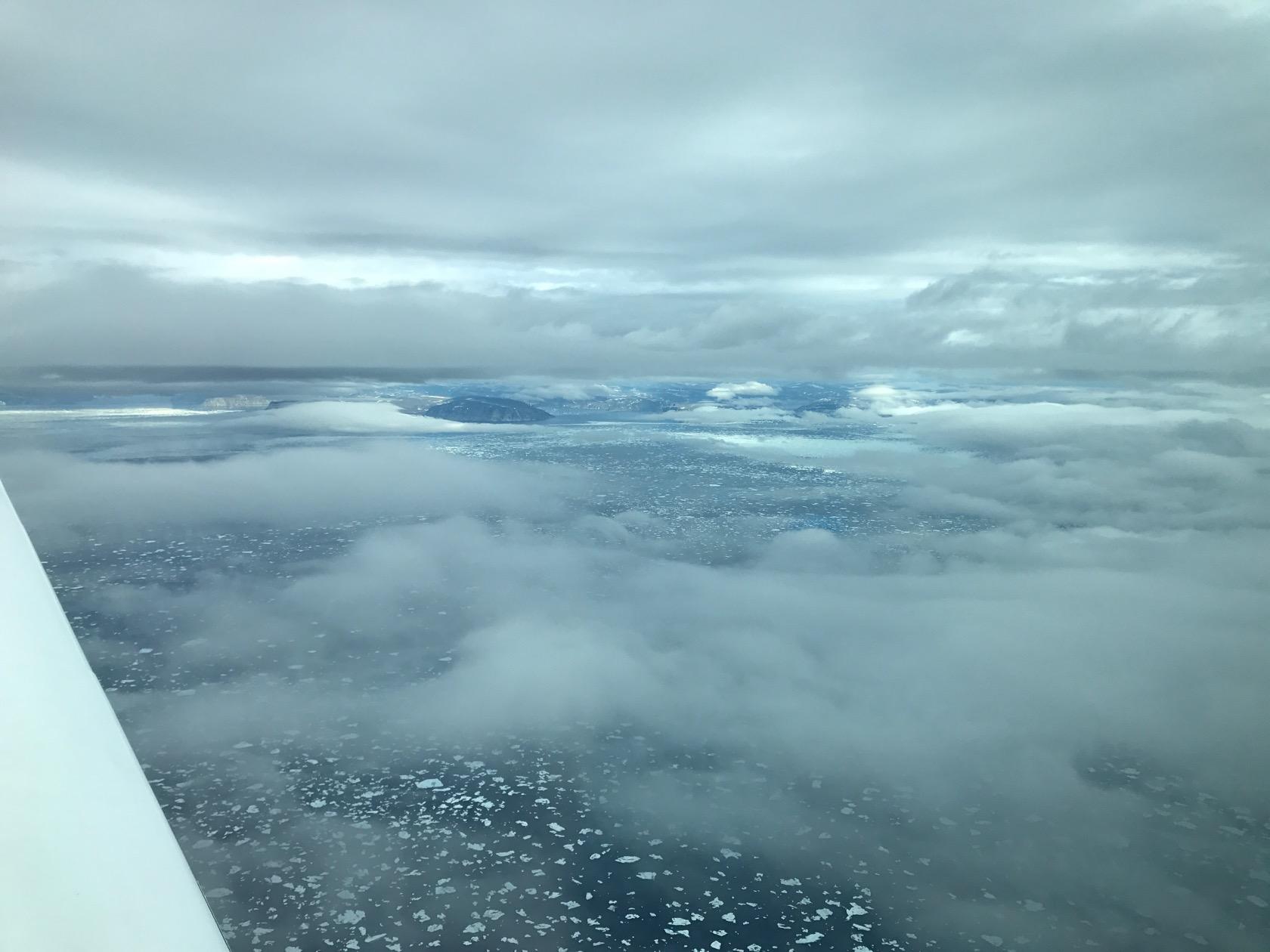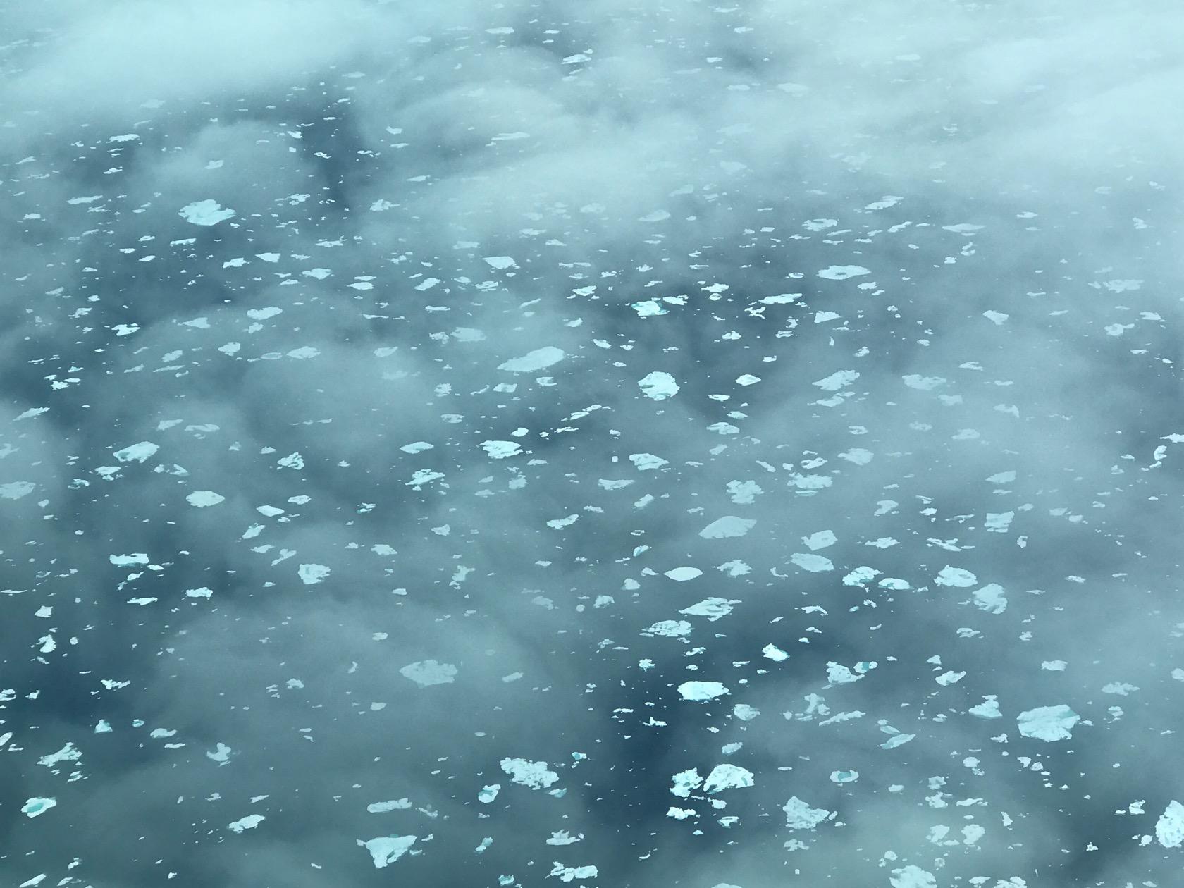 Стали видны айсберги. Разглядеть с высоты их довольно сложно, но один, как бы с чашей нереально голубой воды посередине, мне очень понравился.