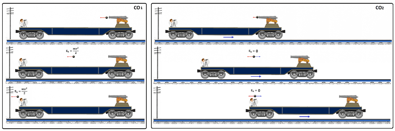 вот! именно. ключевая фраза - "относительно земли"! следовательно, относительно площадки скорость есть, и она не зависит от движения самой площадки относитьельно земли. если в правой картинке добавить попутный ветер, который бы был равен скорости вагончика, то на этих двух картинках процесс станет абсолютно идентичный.нет и его скорости и такое тело находится относительно Земли