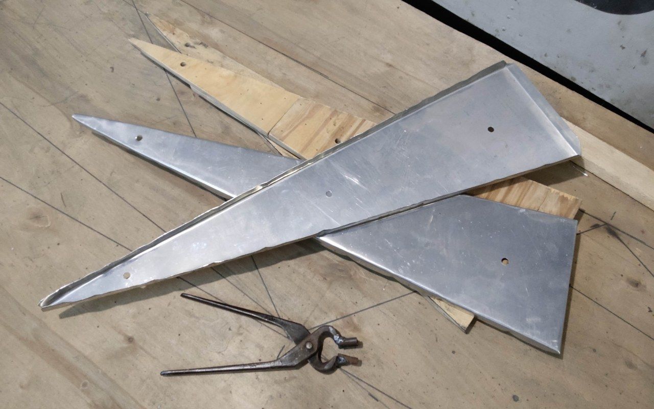 Да треугольники имеют кривизну ,даже нижняя ,не хотелось их спрямлять . Тем более ,что ничего сложного в изготовлении нервюр нет ,хотя я делал это первый раз . По просьбам трудящихся , в деталях проделаны отверстия ,и отбортованы ,не так красиво конечно ,как на видео ,но вполне работоспособно . 12 деталей ,похудели на 200 грамм .