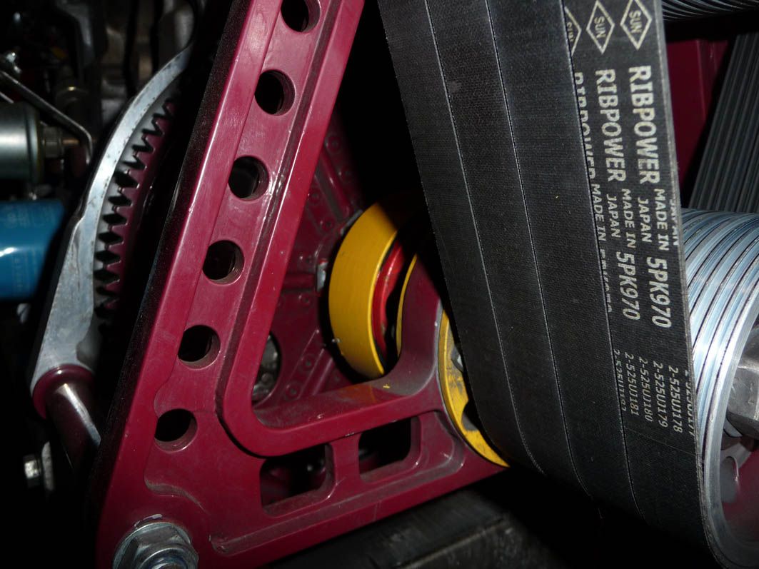 На сайтах ведущих производителей приводных ремней имеются условно бесплатные программы расчёта редуктора. Я использовал программы Gates и Optibelt. Но Вам не стоит беспокоиться. Всё и так работает. И резонансы не грозят потому, что расстояние между шкивами мало, в воздухе висят небольшие отрезки ремней. Поэтому резонансы будут наблюдаться на оборотах выше максимально возможных для двигателя. За счёт большого диаметра шкивов натяжение нужно небольшое. Подшипники должны иметь большой ресурс.