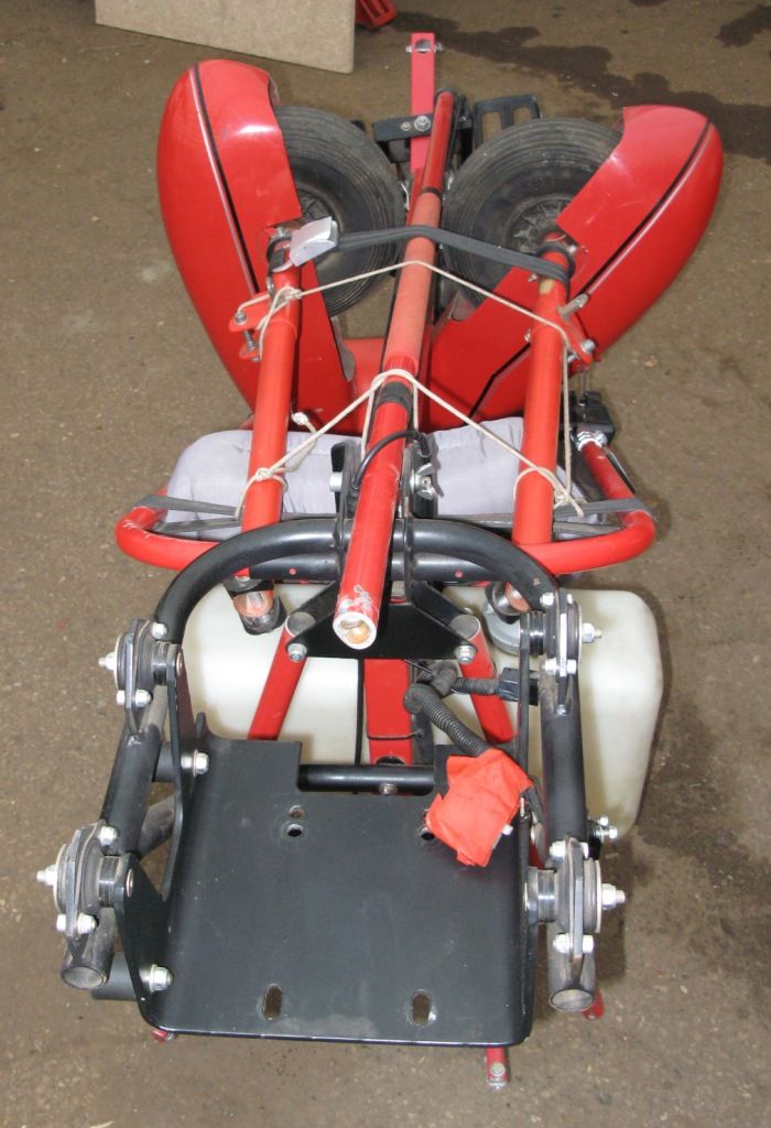 В комплекте тележки имеется : моторама под Ротаксы 447. 503 и РМЗ. Электропроводка под двухтактные Ротаксы, система управления газом от РУДа и ногой, тормозная система на переднее колесо, основные колеса с обтекателями на композитной рессоре, топливная система с пластиковым баком, анотомическое мягкое кресло с небольшим багажным отсеком. Мотора и приборов нет.