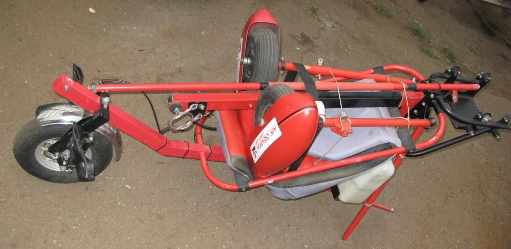 В комплекте тележки имеется : моторама под Ротаксы 447. 503 и РМЗ. Электропроводка под двухтактные Ротаксы, система управления газом от РУДа и ногой, тормозная система на переднее колесо, основные колеса с обтекателями на композитной рессоре, топливная система с пластиковым баком, анатомическое мягкое кресло с небольшим багажным отсеком. Мотора и приборов нет.