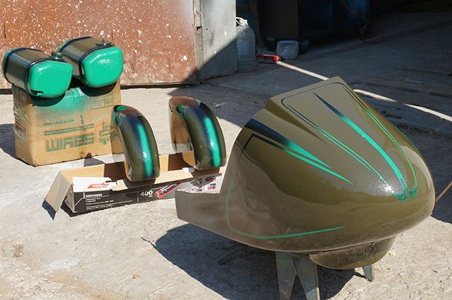 По телеге : Обтекателей на задние колеса нет (но есть не родные, другие похожие по диаметру колеса -  могу доложить может что приспособите), переднего тормоза нет, вилка без пружин, рамка сидения ломается для установки крыла. Бак тот что один, с лодочного.