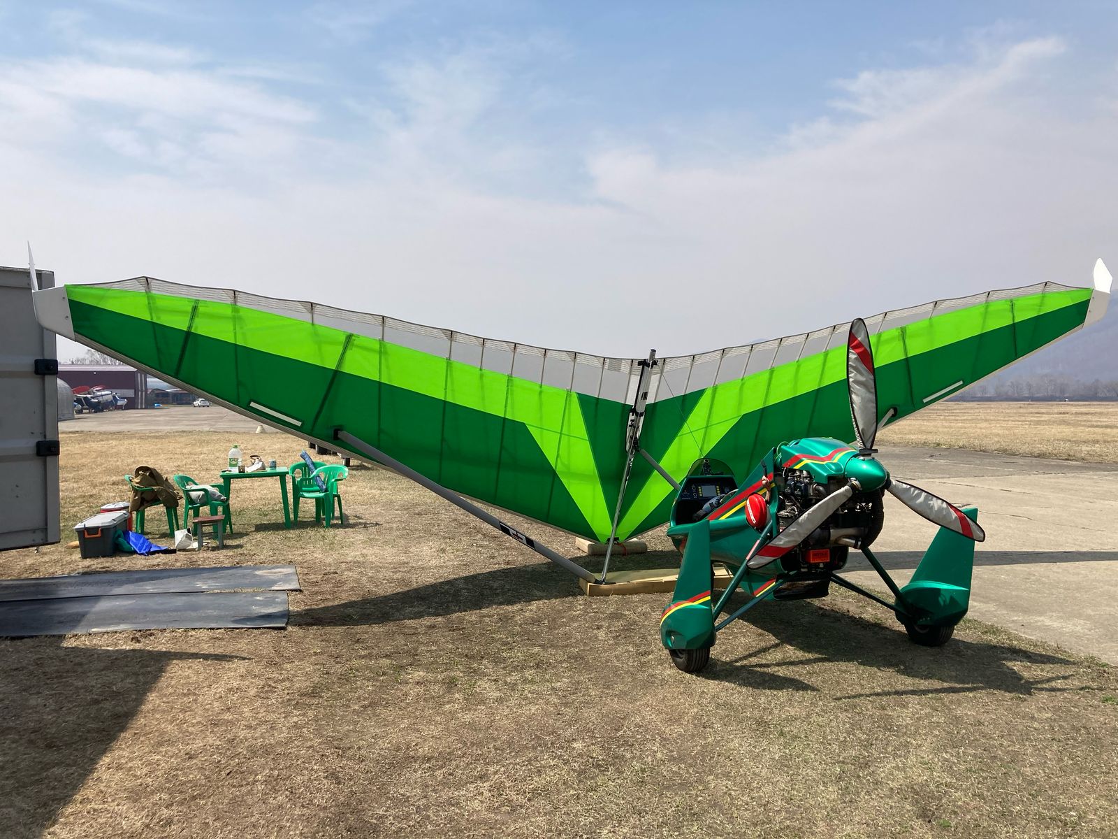 От себя могу добавить - дельталёт ухоженный, в отличном состоянии, грамотно эксплуатируется и обслуживается. Летает редко, но регулярно, как и указал хозяин - с мая по октябрь. Хранится в индивидуальном сухом ангаре в собранном состоянии.
