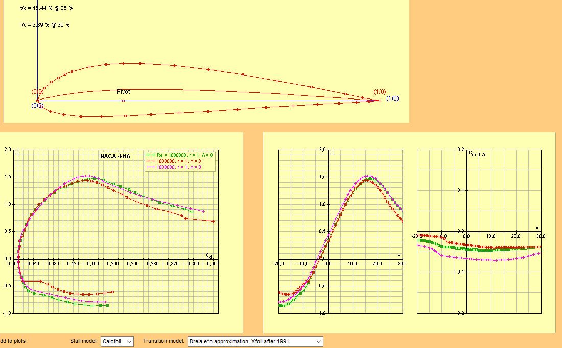 Меня в личке просили гибридизовать Р-II-14 и NACA 4416 и проверить качество, я сделал, но результат не очень полезен. Дело в том, что у меня нет сглаженных координат Р-II-14, а по имеющимся 36 точкам прога даёт ему макс. качество сопоставимое с 4416 при Re 1 и 2 млн. как при удлинении 8, так и при бесконечном.