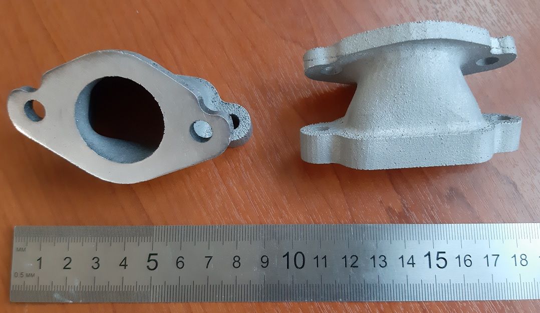 Ближе к теме. Получил сегодня для своего моторчика пару выхлопных патрубков. Напечатаны из российского порошка силумина на 3d принтере, спроектированном и изготовленном в Красноярске полиграфической компанией Полихром.