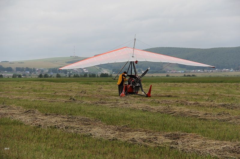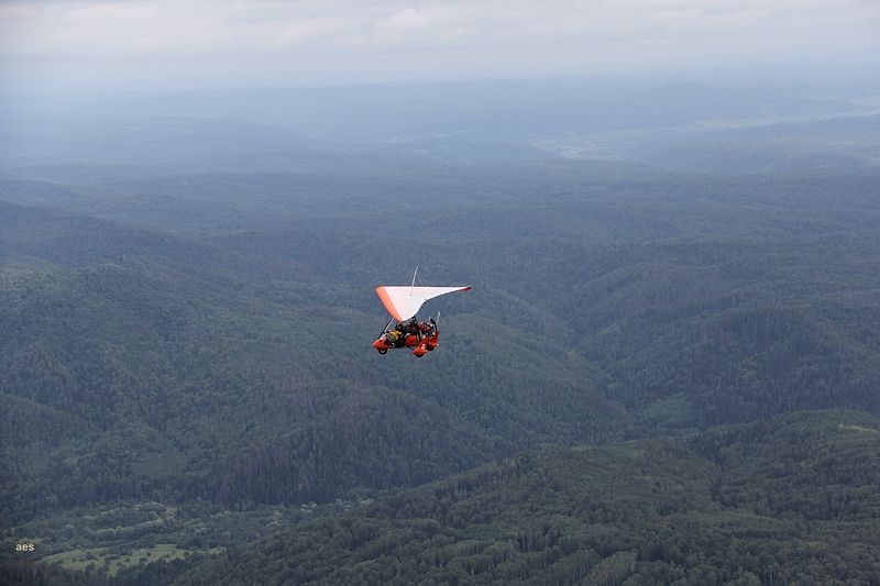 На следующий день с утра, как планировали, вылететь не удалось, метеорологи сказали, что горы закрыты. Похоже погода в горах редко бывает хорошей. Хотя в Читинской  области мы смогли ухватить пол дня солнца, но чаще всего было так, на равнине хорошая погода, а в горы залетаешь  и привет, темные тучи нависают, дождик периодически, и вообще грустно. После пол дня ожидания решили рискнуть, вылететь и посмотреть на эти горы поближе, может удастся проскочить. По мере приближения к ним, тучки становились все крупнее и темнее, но просвет между ними и горами был вполне приличный и мы двинулись на штурм. Чем дальше мы углублялись тем темнее становились тучи, но что удивительно,  практически никакой болтанки. Морально давило полное отсутствие посадок. На равнине, мы всегда стараемся лететь в конусе безопасности, имея в виду всегда возможную для аварийной посадки площадку, здесь же не было ничего, только лес и горы вокруг, и на какую высоту не заберись, все равно ни до какой площадки не дотянешь, их просто нет. А тут еще обнаружилось, что установленные вчера обратно старые лопасти дают довольно приличную вибрацию. Пока набирали высоту,  на повышенных оборотах, это было не заметно, а в горизонтальном полете вылезло в полный рост. ЖПСка  и передний подкос порой тряслись так, что приходилось их рукой останавливать. Я летел и с тревогой прислушивался не растет ли вибрация, но вроде не росла, и через пол часа мозг устал боятся и наконец расслабился. Ну вибрация и ладно, летим же, не падаем, а посадок нет, так ведь, опять же летим, не падаем. А вокруг, между тем, такая красота проплывала, и суровая на вид погода только усиливала эффект. Тяжелые тучи местами цеплялись за вершины и казалось что эти горы не 800-1000 метров а несколько километров высотой. Мы с Саней договорились по радио устроить фотосессию и поснимали друг друга на фоне.  Так потихоньку прошел час полета над горами и я успел основательно замерзнуть. Что то я не подумал, что на такой высоте будет холодрыга, и полетел в летних перчаточках и джинсах, да и естественный надобности на таком холоде быстро обостряются, а тут как раз горы временно кончились и внизу были поля, вполне приятные на вид. Хотелось так же взглянуть на свой пропеллер, вдруг я там не докрутил вчера что-нибудь. Саня гнал вперед, ссылаясь на то что связи нет, и дескать сейчас нас искать полетят, на что я возразил, что десять минут ничего нам не изменят, а мерзнуть и терпеть еще два часа я не согласен, и подсел на подходящее поле возле какой то речки.  Саня тоже сел и продолжал жужжать что поле хреновое что надо скорей лететь, и уже после взлета, что у него от этого поля авиагоризонт отвалился и  не работает, и нечего было тут садится. На самом деле, когда мы уже вылетели из гор и вышли на связь, Челябинск - контроль наше отсутствие воспринял совершенно спокойно. Никто бежать и искать нас не собирался. Погода тем временем потихоньку ухудшалась. Все чаще приходилось нырять в нижнюю кромку чтобы перелететь очередной хребет, периодически начинался дождь, но и мы уже подлетали к выходу. Последний рубеж перед выходом в долину, город Златоуст, лежит в широкой долине , и обойти его по верху гор при такой высоте кромки уже невозможно, да и чего обходить, по плану ведь летим,  да и маршрут здесь проложен, полетели напрямки через город прямо над домами и улиц