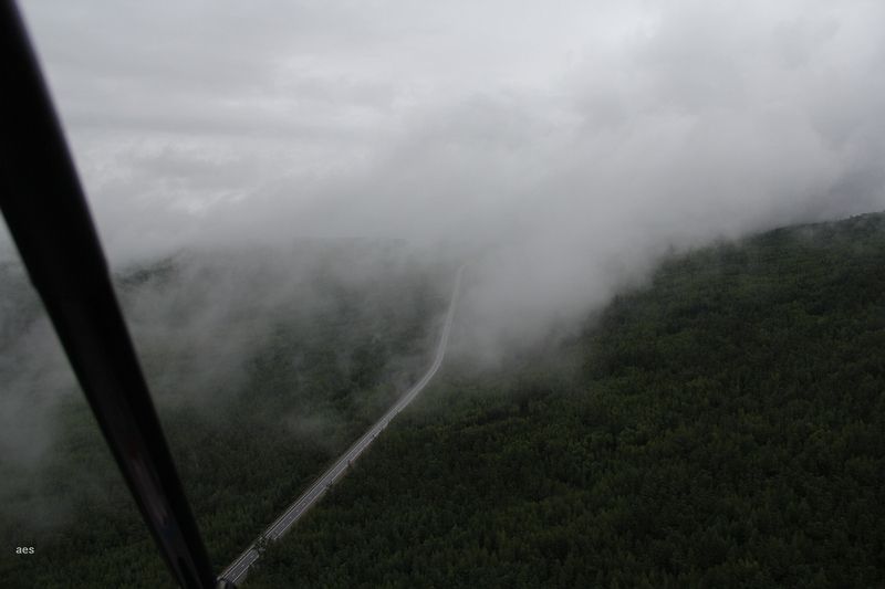 Через час, дождь наконец отнесло немного  в сторону, и мы вылетели дальше. Очаги дождя стояли справа и слева, нижняя кромка лежала уже на вершинах сопок и простора для маневра стало намного меньше. Приходилось лететь ниже вершин сопок, прямо над дорогой и строго друг за другом. Саня летел впереди и периодически терялся из виду за  рваными туманными космами свисающими из туч. Полет стал напоминать парный слалом между сопок с периодическим подпрыгиванием над очередным хребтом и  залетом в низкие тучи. Такой полет не мог продолжаться долго и в конце концов в очередном каньоне нас все таки прижало. С двух сторон тянулись гребни сопок, сверху все это было накрыто туманной крышкой и трасса на дне каньона, поднимаясь вверх, уходила в этот туман. Мы летели уже над самыми верхушками деревьев, когда Саня нырнул в это туманное марево и скрылся в нем. Я как то быстро представил что сейчас будет. Дорога уходит вверх, видимость падает до минимальной, и останется, только лишь, садится на дорогу прямо под собой, но не факт, что дорога в этом месте будет пригодна для посадки, да и увидеть на ней едущую машину не удастся, а для разворота обратно придется нырять вверх в туман, и разворачиваться там с большим креном, поскольку каньон узкий, и удастся ли выйти живым из этого разворота – не факт. Ситуация быстро превращалась в русскую рулетку и точка невозврата, после которой пришлось бы играть в нее до конца, ощущалась где то совсем рядом, так что я сказал Сане что он как хочет а я разворачиваюсь и сажусь. Тот участок дороги  который мы только что пролетели вполне подходил для посадки. Саня побурчал еще немного на меня, что дескать еще немного и прошли бы перевал, но тоже вернулся и сел.