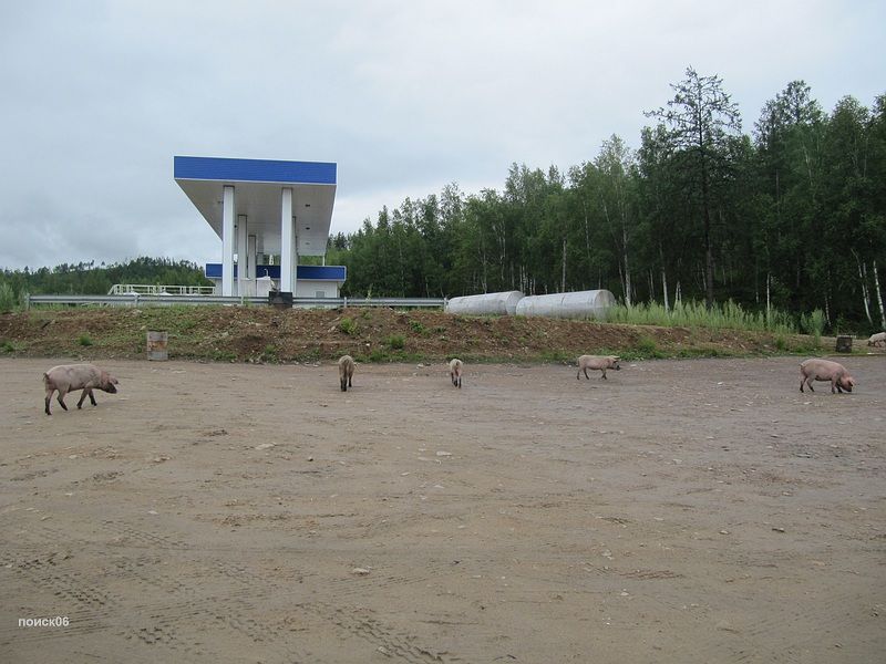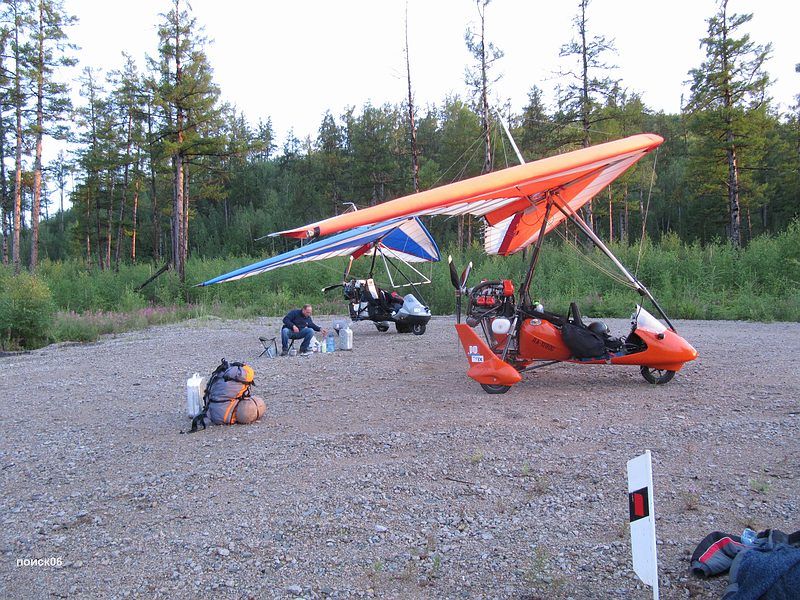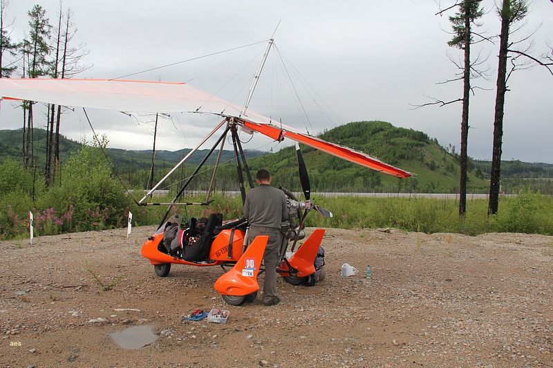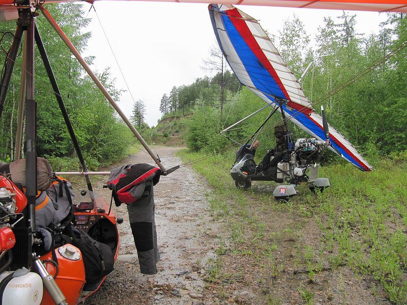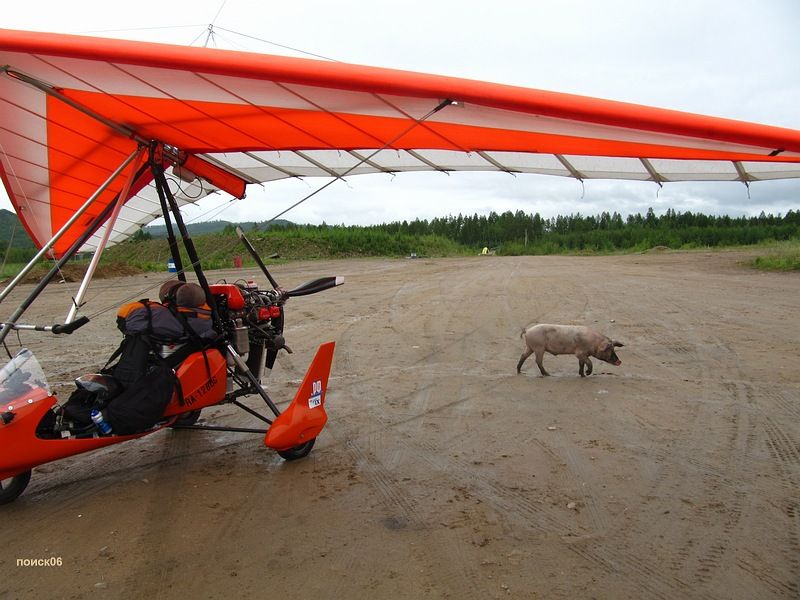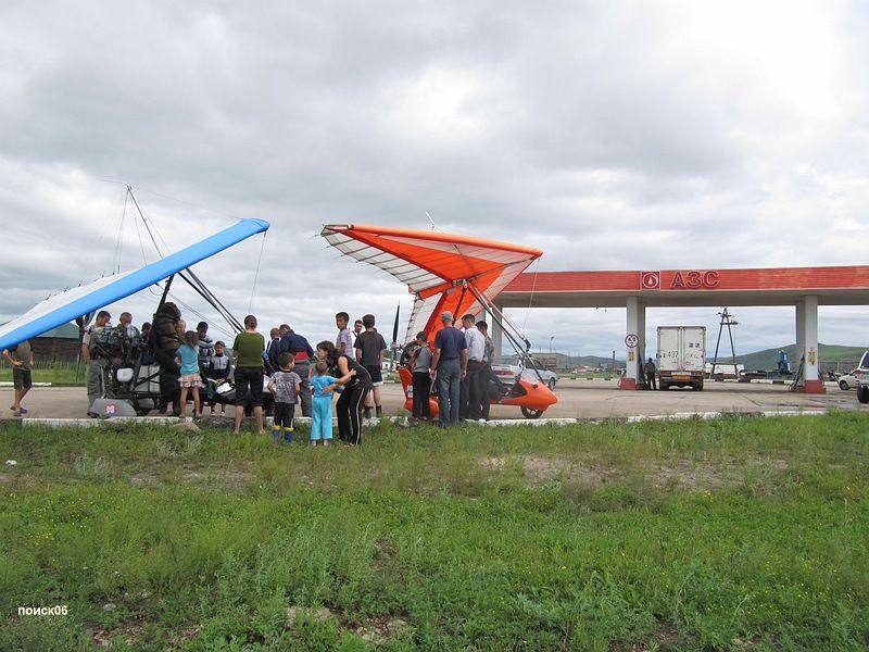 Пролетели буквально тридцать километров и оказались над Чернышевском. Здесь когда то была грунтовая площадка для АН-2 но сейчас она заросла травой, и от нее до заправки было довольно далеко, а участок трассы рядом с заправкой был весь разгорожен проводами. Не то чтобы совсем нельзя было сесть но следовало крепко подумать. Мы летали минут десять над городом примеряясь и обсуждая по радио разные варианты и остановились в итоге на посадке на трассу рядом с заправкой. Для этого надо было пройти прямо над проводами ЛЭП, сесть максимально близко от них и успеть оттормозится до поворота на заправку. Все было настолько экстремально, что после этой посадки у меня глаза были наверно на выкате от адреналина, видимо поэтому я, заезжая на заправку, умудрился врезаться концом крыла в знак на повороте. Удар был довольно чувствительный и я, проклиная себя за невнимательность, пока парковался, уже прикидывал что там скорей всего порван парус или законцовка сломана, но все обошлось, только знак развернулся. На заправке нас тут же окружила толпа, и это жутко раздражало. Все стремились все потрогать, подергать и понажимать. Пришлось Сане следить за дельтами и отгонять особо любопытных а я бегал с канистрами и заправлял баки. Дело осложнялось жарой и тем что я был в теплом комбинезоне. Переодеваться было некогда, надо было быстро заправляться и уматывать пока нам тут тачки не разобрали, поэтому, в конце процесса, я в своем комбезе практически плавал от пота. С трудом разогнав толпу от винта, я запустился и поехал на трассу и дети тут же рванули за мной.  Пришлось поддать газу и рулить побыстрее, чтобы от них оторваться. Я очень боялся что сейчас с трассы свернет какая-нибудь машина и придется притормозить, и тогда какой-нибудь ребенок точно влетит мне в винт, но все обошлось, трасса была пустая и я быстро порулил на взлет. Движение по трассе хоть и не очень сильное но все равно пришлось пропустить под крылом машину прежде чем я доехал до точки начала разбега, и взлетать не мешкая потому что сзади уже приближалась фура, а Сане пришлось подождать когда уляжется спутка от этой фуры. Она у нее не хуже чем у взлетающего самолета. Какое то время я летел низко пытаясь высохнуть и не замерзнуть при этом, но потом все равно пришлось подняться повыше, потому что опять начинались сопки. Через эти сопки нам предстояло лететь километров пятьсот, а погода между тем не радовала, похоже мы догоняли фронт, потому что чем дальше мы летели тем ниже становились тучи и хуже погода. Километров через сорок мы уже проползали над самыми вершинами сопок, а еще через шестьдесят, уперлись в дождь и пришлось подсаживаться на трассу. Саня предлагал попробовать пролететь подальше, но я уже присмотрел сверху неплохое вроде бы местечко со съездом с трассы и большой поляной. Правда, когда я туда заехал, там оказалось довольно уныло, грязно, мокро и толпами шастали свиньи, норовя залезть в аппарат. Саня попытался пролететь еще вперед, но промок под дождиком и вернулся.