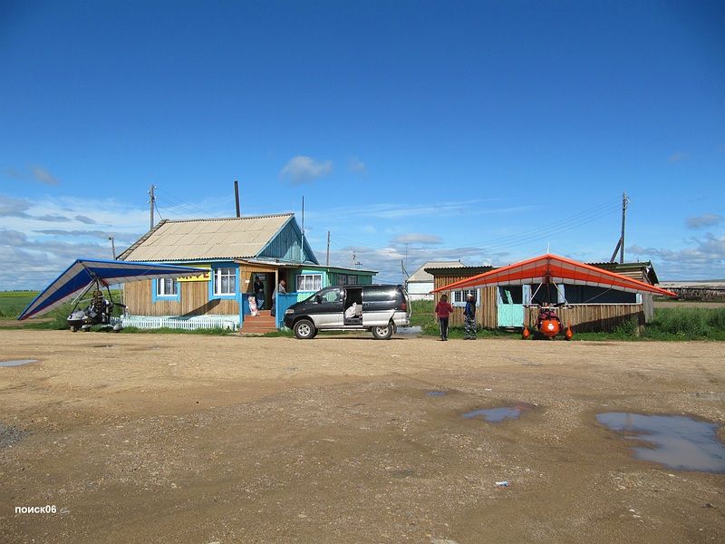 Через час благополучно добрались до Могочи. Сверху вроде город как город. Аэродромные постройки правда в разрухе, как после бомбардировки, но полоса еще в очень приличном состоянии. Сели на нее, чем слегка подломили кайф трем славным Могоческим парням. Они расслаблялись на полосе, сидя в своей машине с девочками и пивом, а тут мы. Пришлось сфотографировать их у аппарата и пообещать,  что обязательно выложу фотку с ними в интернет. Попытался прояснить у них ситуацию с бензином, но ответ не вразумил. Вроде бы 95-го нет нигде, но может быть где - то есть. Саня в это время дозвонился до человека, с которым мы договаривались и тот сказал, чтобы мы подрулили к аэродромному складу ГСМ. Тут дело забуксовало, товарищ, с которым договаривались, никак не подъезжал, а все попытки выяснить что - то про бензин у людей на аэродроме натыкались на какое - то глухое безразличие. Да и сами люди, какие - то странные, через одного с каким - то пустым взглядом или вообще со стеклянными глазами навыкате, но нас предупреждали, что Могоча -  это стремное место и я уже ничему не удивлялся, даже когда они подрались у меня на глазах. Тем временем подъехал долгожданный товарищ, и выяснилось, что бензин есть прямо здесь, на аэродроме, но его еще надо было достать. Процесс заправки выглядел так -  мужики черпали бензин ведром на веревке со дна огромной цистерны, стоящей посреди лужи с водой, затем спускали ведро по лестнице, передавали через лужу мне, и я на берегу разливал бензин по канистрам. Бензина в цистерне было уже на донышке и все это напоминало хождение к колодцу за водой. Заливать таким образом добытый бензин, хоть он и был когда - то 95-м, было как - то стремновато и я уговорил Саню его разбавить нашей волшебной жидкостью, а для этого надо было сначала разбавить тестовую бутылочку, и подождать пол часа.  Саня еле вытерпел пятнадцать минут. Нам очень хотелось улететь поскорее из этого странного места, да и  хорошая погода не могла стоять и ждать нас, но я уговорил его еще на пять минут и  только после этого разбавил весь остальной бензин.