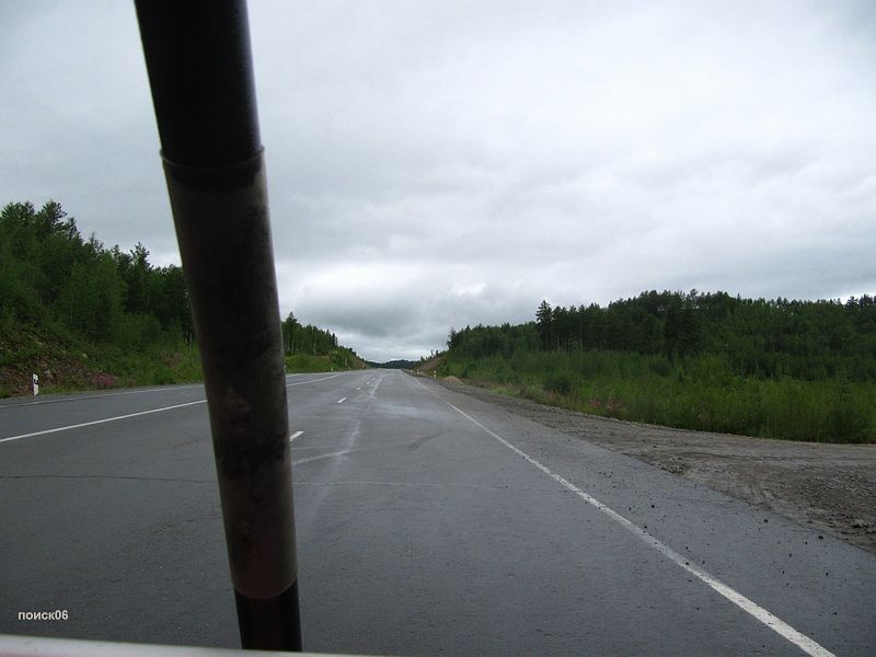Стоять на дороге было не где, обочины были узкие и  круто уходили в глубокие кюветы, но, на наше счастье, нашелся не слишком крутой съезд приличной ширины и мы забились в него вдвоем. Дальше этот съезд выводил на большую поляну, но чтобы проехать туда пришлось бы пилить деревья по краям. Этот вариант мы оставили на тот случай если погода не улучшится и придется остаться здесь ночевать. Погода никак не улучшалась, шел мелкий моросящий дождь, по склону на котором стояли наши дельты рекой текла вода, делать было нечего, мы стояли под крыльями и обсуждали произошедшее. Саня говорил что ничего страшного не было, дорога под нами ,и если что можно всегда сесть, а я рассказал как виделась ситуация мне с места ведомого, что его желание переть напролом через туман, дождь и сопки меня здорово напугало, если он дальше собирается так же лететь то все может запросто закончится плачевно. В итоге договорились что я теперь пойду ведущим, и как только ситуация покажется мне опасной, сразу садимся.