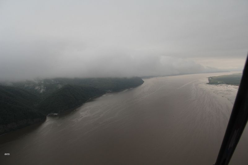 Ближе к воскресенью прогноз несколько раз менялся и мы решили уже смотреть по фактической погоде. Если в воскресенье будет что-нибудь видно, то полетим. Вроде на маршруте сильных осадков вандерграунд не предсказывал. Утром в воскресенье нижняя кромка на взгляд была метрах на ста, но ветер не сильный, и в предыдущие дни с утра картина была похожая, а потом погода разгуливалась, так что решили лететь. За время путешествия были разные полеты, иногда красивые и спокойные порой даже скучные,  иногда напряженные и даже временами пугающие, одним словом – интересные, и в этот  раз я не скучал ни секунды. Мы, то летели в узкой щели между водой и тучами, то ныряли в тучи и пролетали в слоях – коридорах. После Богородского нижняя кромка вроде бы приподнялась немного но зато пошел дождь, затем дождь кончился но нижняя кромка упала совсем, и пришлось продолжить полет над облаками. В Мариинском у нас была запланирована посадка, и к нему удалось спустится через просвет в облаках. Пока сидели в  Мариинском нижняя кромка с вполне приемлемых 150 метров успела спустится до 70. После взлета нам еще минут пять удавалось видеть друг друга а потом видимость еще ухудшилась  и мы потерялись. Впереди по маршруту перспективы были туманные и решили пробиваться наверх. Чтобы не встретится друг с другом в облаках пробиваться решили расходящимися курсами. Когда спускались к Мариинскому верхняя кромка была на 250 метров. Но вот уже и триста на высотомере а солнца все не видно. Мотор, работая на взлетном, разворачивал телегу и чтобы удержать ее на курсе пришлось  давать приличный крен.  На пятистах метрах наконец вверху посветлело и вскоре я выскочил к солнцу. Саши нигде не было видно. Я запросил его по радио и он сказал что еще в облаках. Прошло еще секунд тридцать прежде чем он сказал что тоже вынырнул. Выныривал я около пяти минут, но какими они показались долгими. Тренируясь летать с авиагоризонтом я заныривал в  небольшие облачка секунд на тридцать и никогда еще так на долго, и хотя я тренировался летать, глядя только на авиагоризонт, по пол часа, но это совсем не то же самое что лететь в реальном облаке. Нам еще повезло, что мы начали пробивать облачность в этом месте, так как дальше верхняя кромка уходила еще выше, почти на километр. Ближе к Комсомольску, погода, устав трепать нам нервы начала налаживаться. В сплошной облачности, над которой мы летели, начали появляться разрывы и мы спустились через один из них обратно к Амуру. Перед самым Комсомольском облачность развалилась совсем и остались только приятные такие кучевки. На подлете нас встретил в воздухе Ваня Ивакин и с ним долетели до площадки.