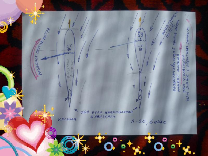 Простите, но у ВасТеперь о боковом ветре.Представим фюззеляж самолета А-20,Бекас,или Синтал.Скорост 50,боковик 25км\час.Фюззеляж в плане(сверху) имеет каплевидная форма,воздух обдувает его справа под углом 20+ градуса.Он создает боковую подъемную силу слево.Меняя подъемную силу ГО,получаем сколжение и можем удержать самолет точно и устойчиво по оси полосы.А с креном и устранит боковое сколжение.Что не так просто с класической схемой.Поэтому самолетики типа Бекаса(тандем,а не рядное располдожение пилотов) хороши в боковом ветре,слушаются хорошо руля направления.