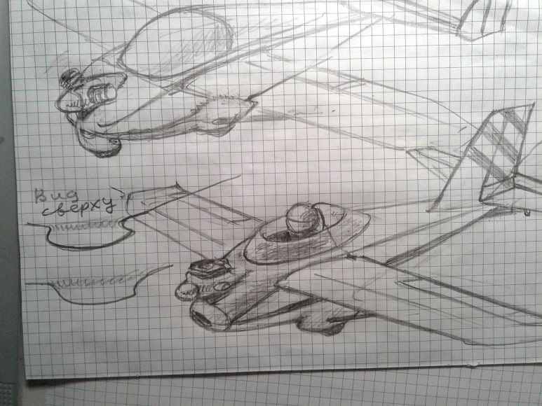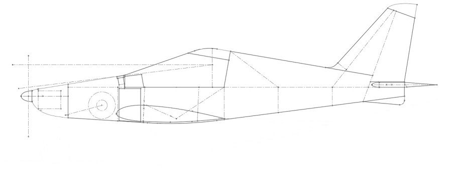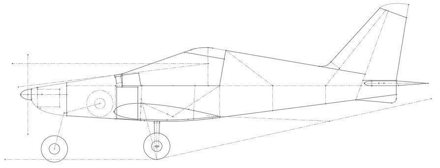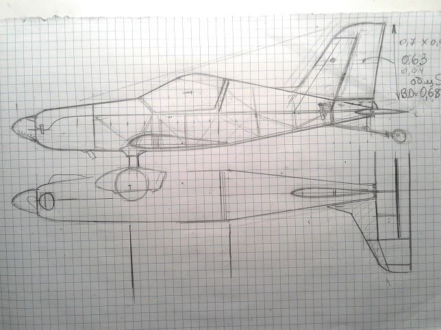 В качестве отступления накидал быстренько эскизик под данный движок, оставив крыло и Г.О. без сильных изменений. Шасси уборное (при таком весе двигателя, можно позволить себе уборное), вы не раз о таком упоминали, с простым механизмом уборки одним движением ручки. Так как крыло вставляется в фюзеляж, то основное шасси подразумевает крепление на подобии "Мессера"