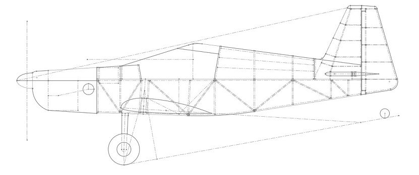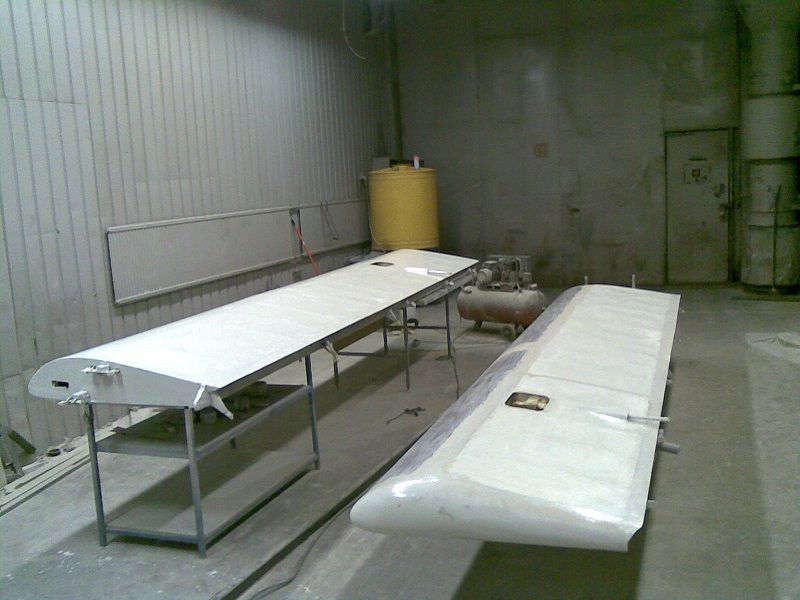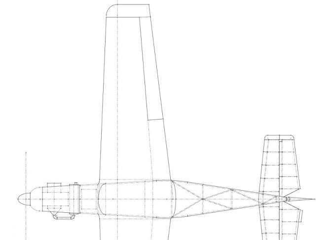 Изначально предполагалось крыло подвешивать снизу, так как узел навески получался очень простой и легкий, но это вызывало бы некоторое неудобство при транспортировке и хранении а заодно и усложнило фюзеляж в месте навески что практически съедало бы преимущества такой стыковки (вес выигранный на узлах, добавился на фюзеляже), а неудобства остались. По этому и появилось разъемное трапецевидное крыло что бы компенсировать возросший вес узлов и остаться в прежнем весе при той же эксплуатационной перегрузке. При этом несколько сместился цт консоли к оси, уменьшилась САХ и чуть-чуть выросло удлинение (хотя что касаемо САХ и удлинения, изменилось оно весьма не значительно). Правда заплатить за это придется разными формблоками под каждую нервюру, ну да куды дениссии 🙂.
