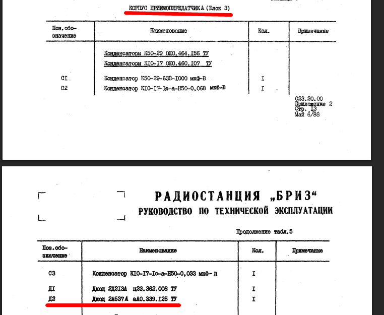 Понимаю, что 10 лет прошло, но хотелось бы уточнить - в усилителе мощности нет диода 2А537А, он всего один в Бризе и находится в "корпусе приемопередатчика". Зато есть 2Д212А - 2 шт.