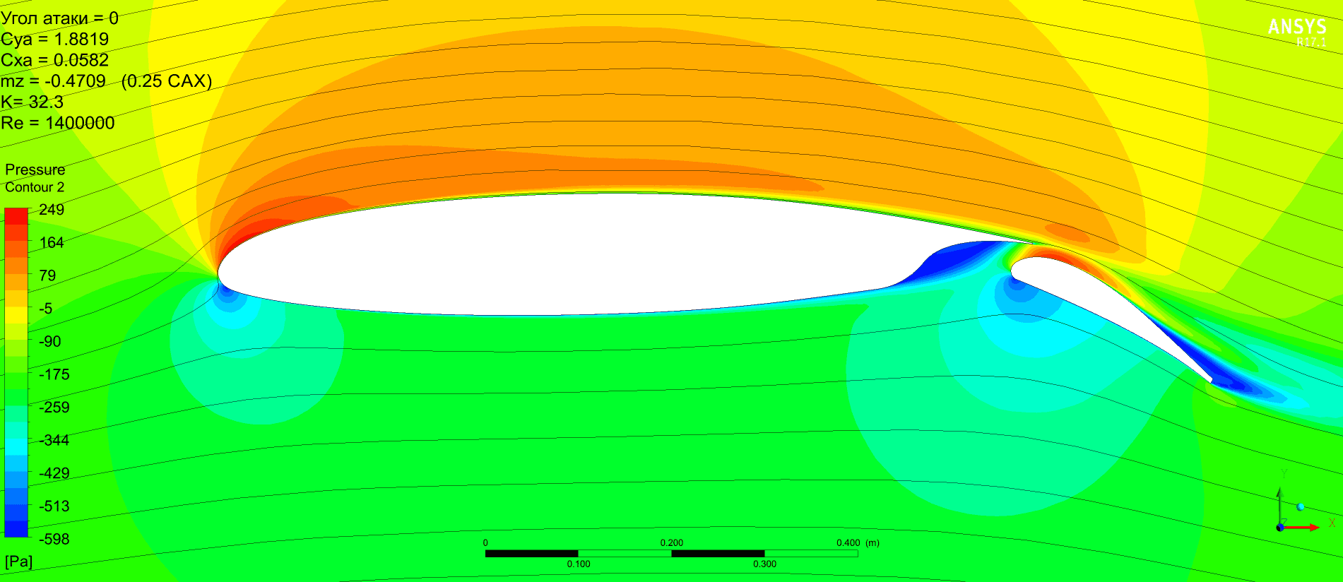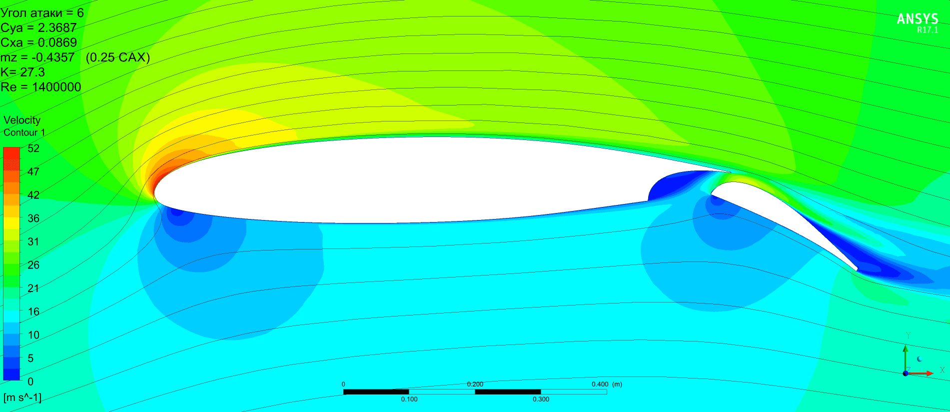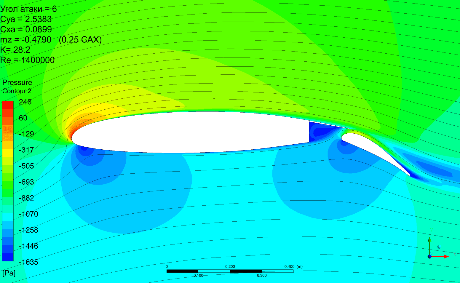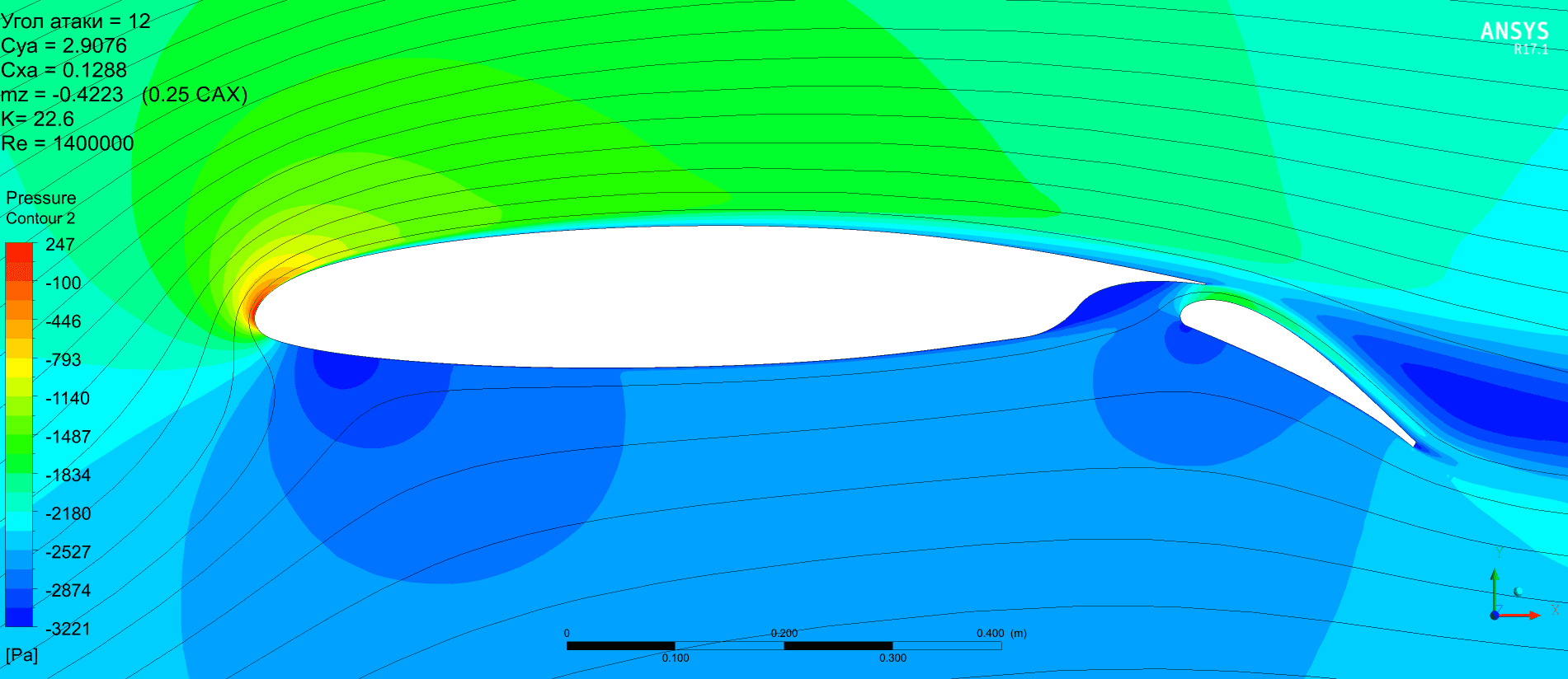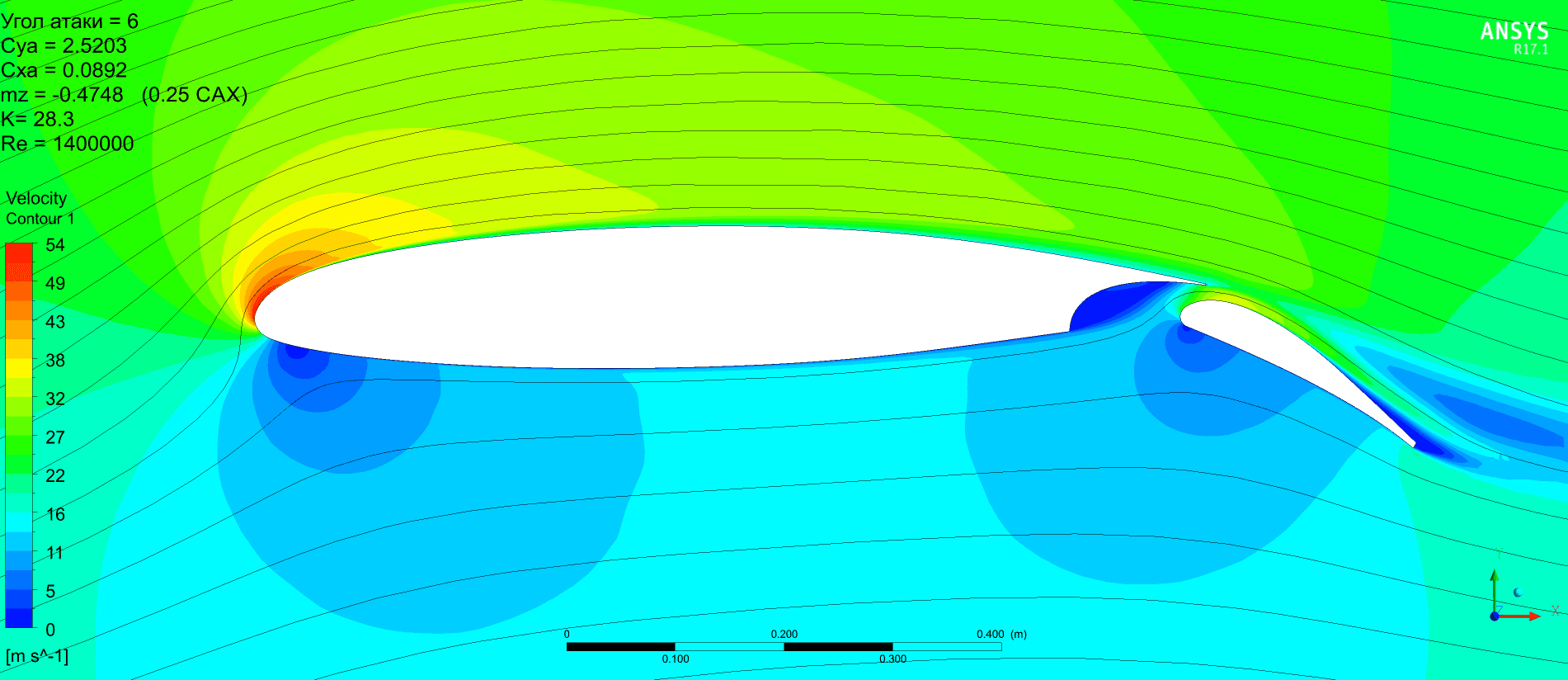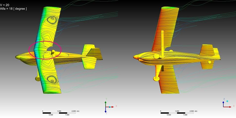 Но можно отметить, что качество получается выше, Су растёт монотонно без провалов. Картинка по пикам давления менее пятнистая. Срыв по достижении критического угла атаки в обоих случаях резкий и глубокий. Начинается на предкрылке. Однозначно сказать, что предкрылок не даст самолёту сорваться в штопор наверное нельзя.