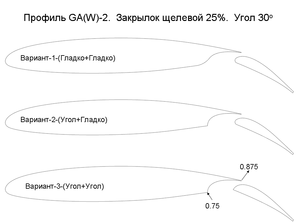 Расчёт профиля GAW-2 с щелевым закрылком 25% хорды, угол отклонения 30 градусов. Исследовалось влияние оформления щели на характеристики профиля.
