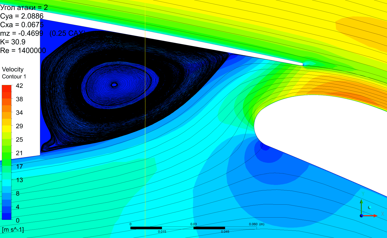 Ну Су с закрылком мы пронаблюдали, а вот хотя бы Сх без было б неплохо увидеть. Вообще немного странная последняя картинка, по идее за задней полкой вихрь должен устанавливаться, который  испортит картину обтекания закрылка сверху, и интересено, что момент практически в этом варианте не меняется. Выходит АНСИС стрим лайны вихрей не рисует.