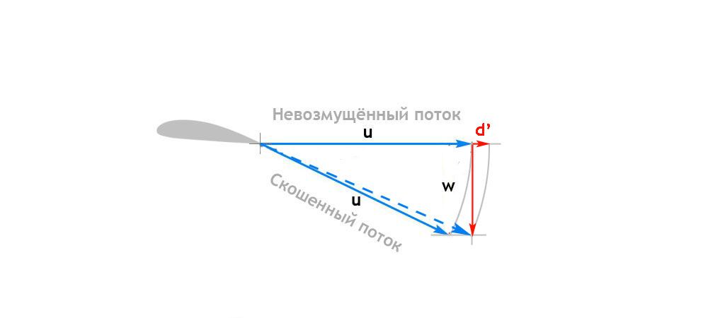 Получается, что мы разгоняем воздух вниз за счёт тяги, хотя и опосредовано: разгоняем продольно (на величину d'), но избыток продольного импульса крыло "перекачивает" в поперечный.