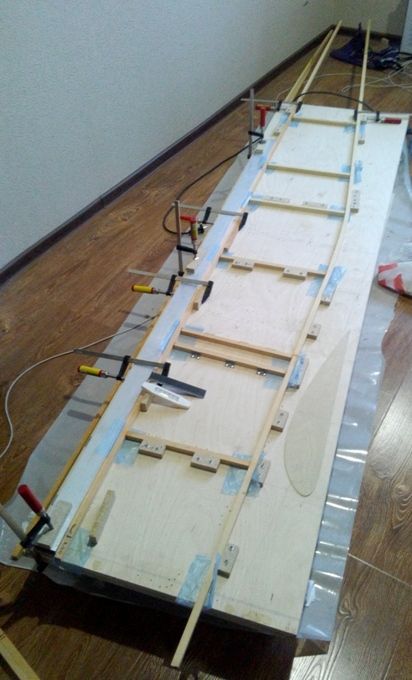 Склеил одну половинку, рейки 15х15 и 12х15. Сегодня заложу вторую. хвостовая часть не поместилась, поэтому будет клеится дополнительной операций. На переднем плане профиль для крыльев, который нарисовал сам.   Хорда 600мм, Нмах-96мм на 30% хорды.  Толщина значит 16%