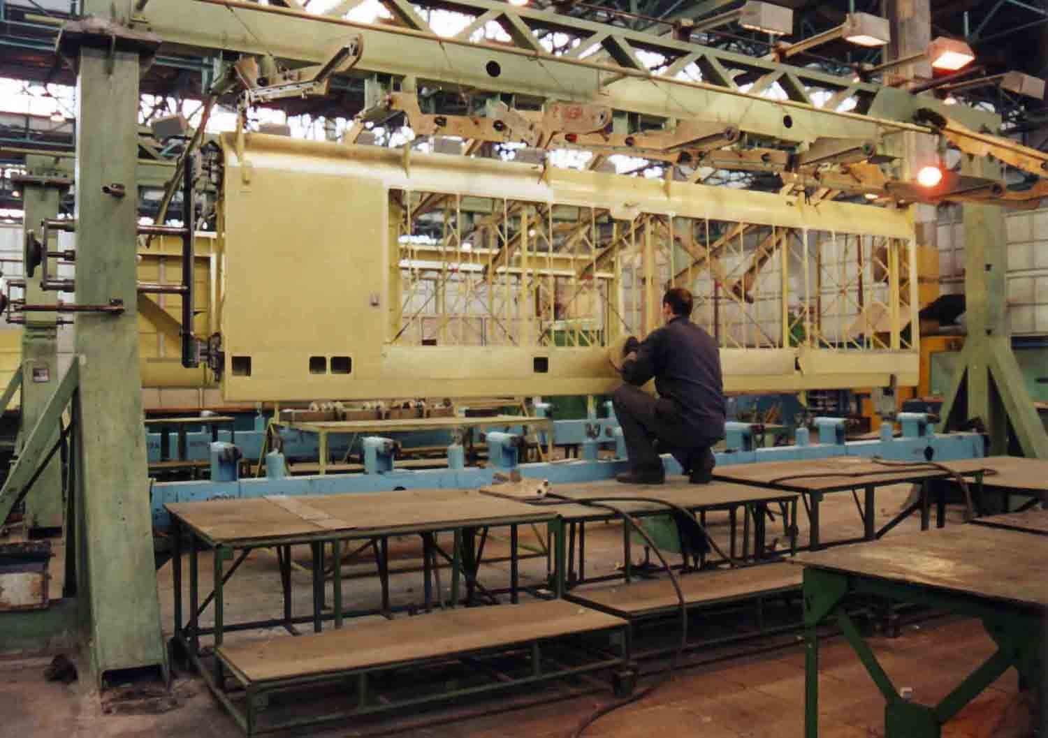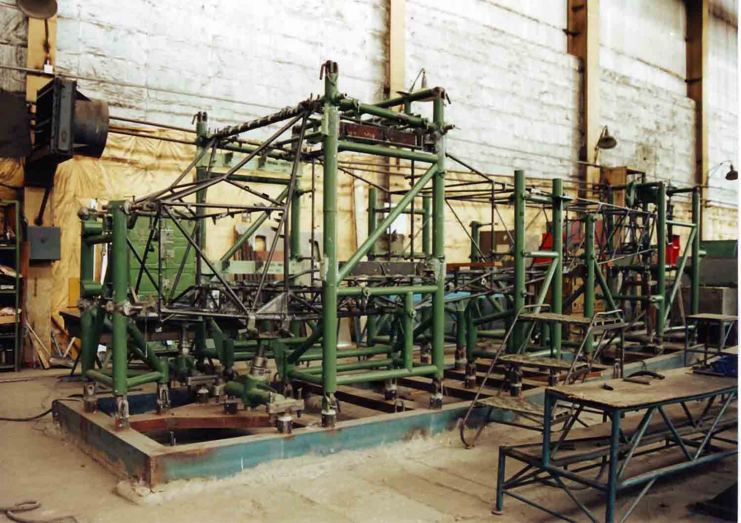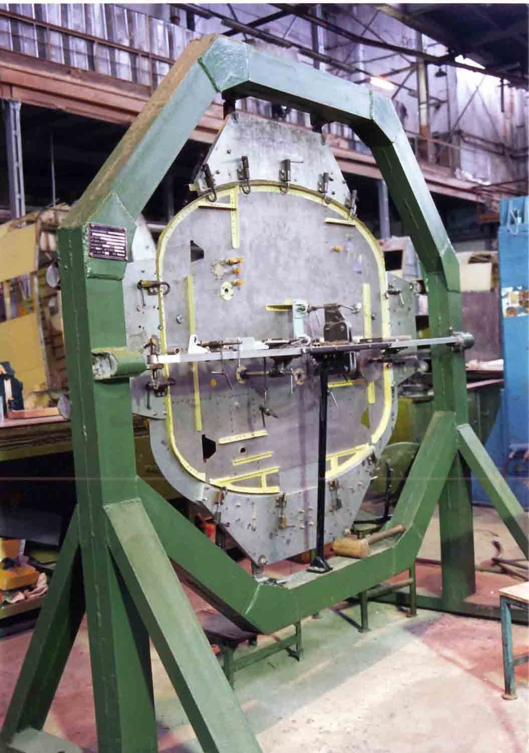 На первой фотографии стапель окончательной сборки фермы Т-411, на второй фотографии, стапель окончательной сборки крыла (рубильники подняты). И на последней фотографии кондуктор сборки противопожарной перегородки. Она, кстати, сделана из титана. Если внимательно присмотреться, то заметно, что она довольно сильно отличается от перегородки Як-12.