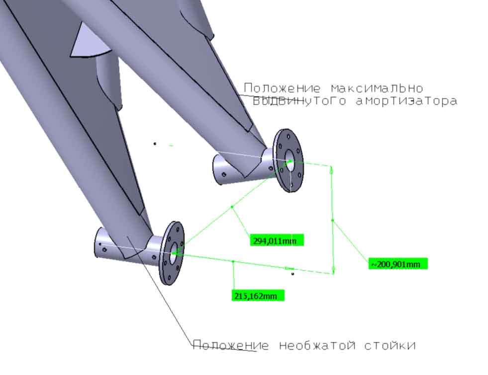 Главные стойки трапецевидные с гидрогазовыми амортизаторами. Ход амортизатора порядка 150 мм. Как меняет свое положение стойка, см. картинку. (колеса условно не показаны. Показаны ступицы в крайних положениях).