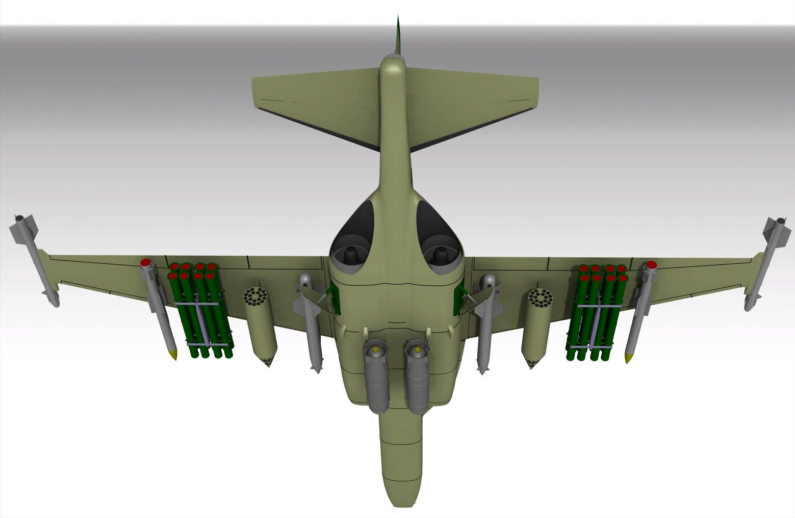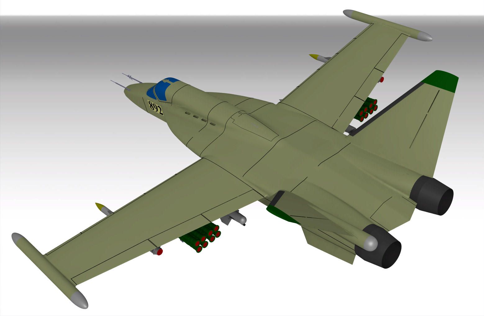 Двигатели больше чем на Су-25 и они разнесены в стороны, поэтому гондолы только похожи на Су-25, на самом деле они значительно шире.  Шасси укладывается не точно вниз по центру, а вниз  в "угол". Размещение бомб, возможно не такое как я показал. По причине большой ширины (а значит и объемов), и по причине меньшего аппетита РД-33, я не показываю ПТБ, возможно они не нужны были бы в большинстве операций.