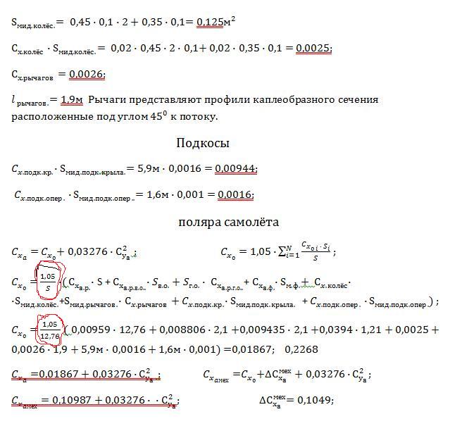 Действительно,присланный расчет довольно сумбурный - и наряду даже с необязательными на этом этапе подробностями,сколь-нибудь внятной сводки сопротивлений я не увидел:скажем,Сх*S фюзеляжа так и остался для меня загадкой.Для простоты восприятия другими Ваших результатов,следовало бы привести упомянутую сводку в виде таблицы,где перечислялись бы агрегаты,площадь сечения каждого,их Сх и произведение Сх*S с последующим суммированием и отнесением к площади крыла.