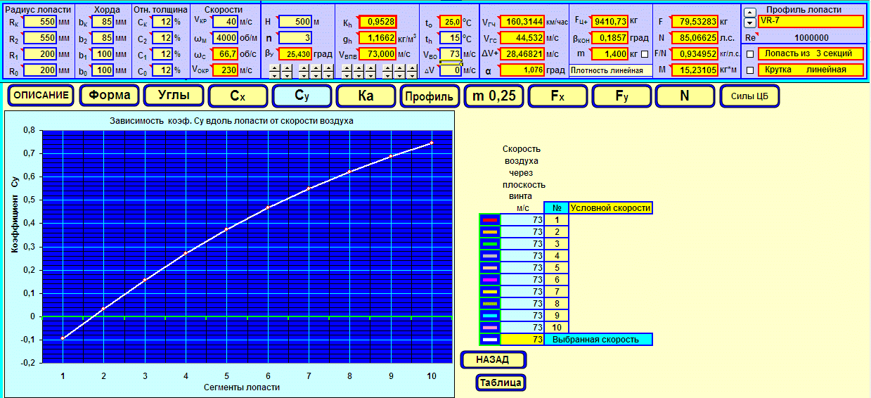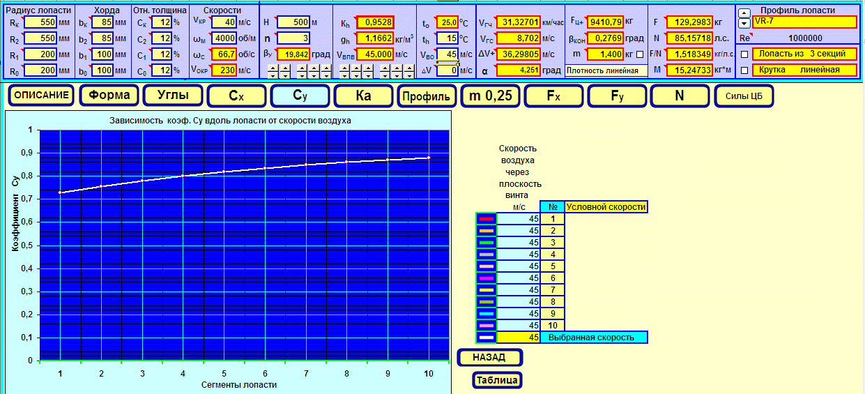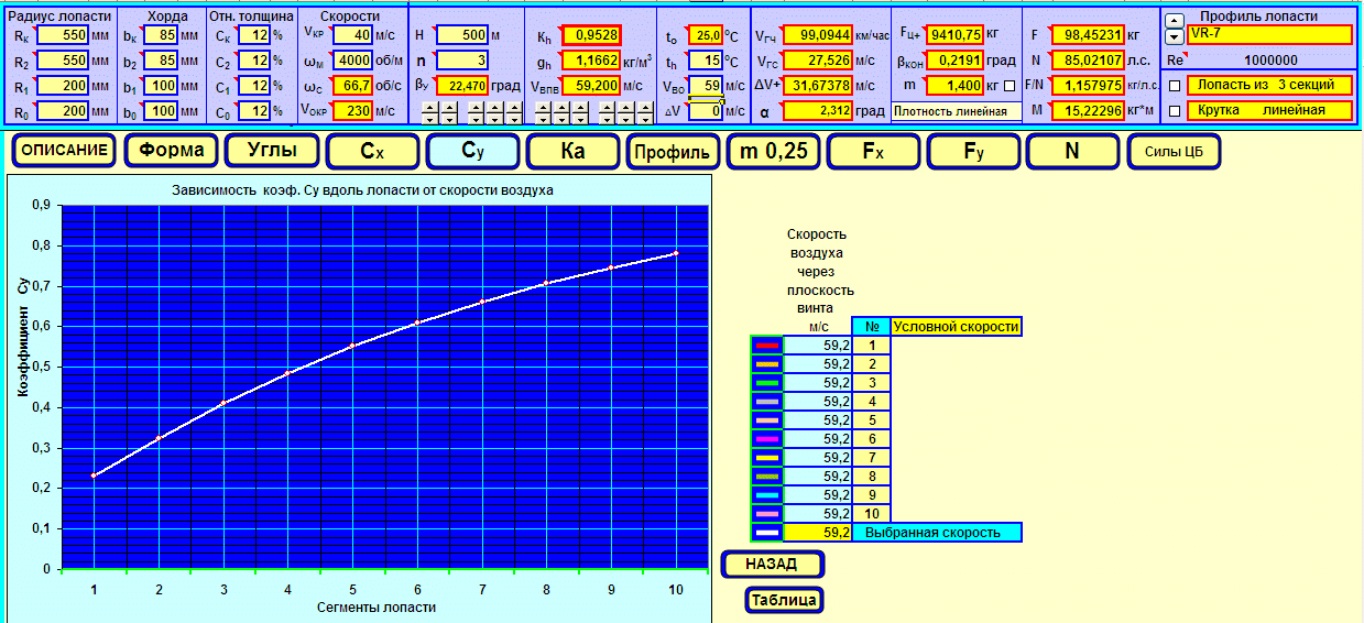 Я в расчет ввел скорость вращения равную 4000 об/мин. Иначе получается сверхзвуковая скорость на конце лопасти.