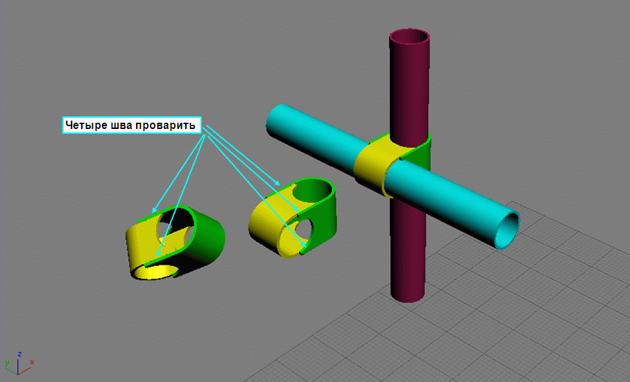 По прочности такая фитюлина не слабее самих труб и на разрыв по петлям и по сварному шву. Соединяются трубы на клею. Площадь клеевого шва по прочности соизмерима с прочностью труб. Трубы нигде механически не нарушены. Такое соединение труб крест на крест самое простое и самое прочное.
