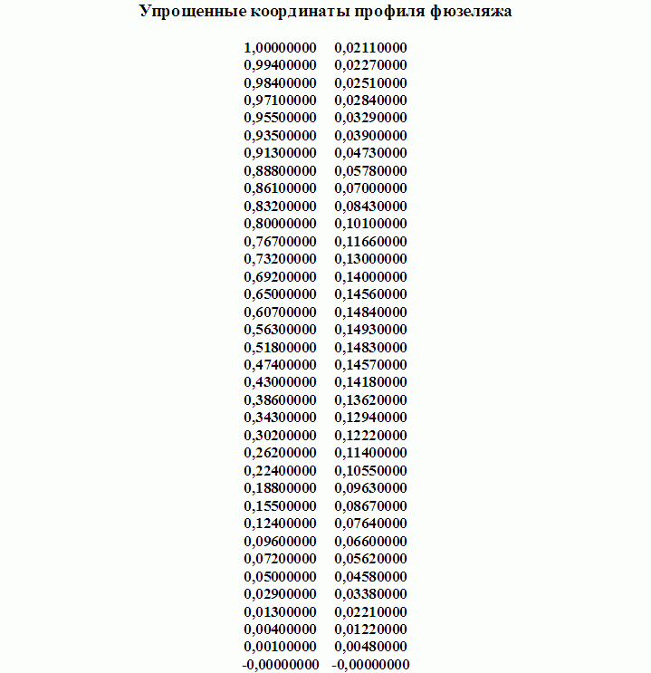 Генрих, я снял координаты профиля фюзеляжа из Вашего рисунка, а программа сама апроксимировала остальные точки. Это только одна половинка профиля так как он симметричен.
