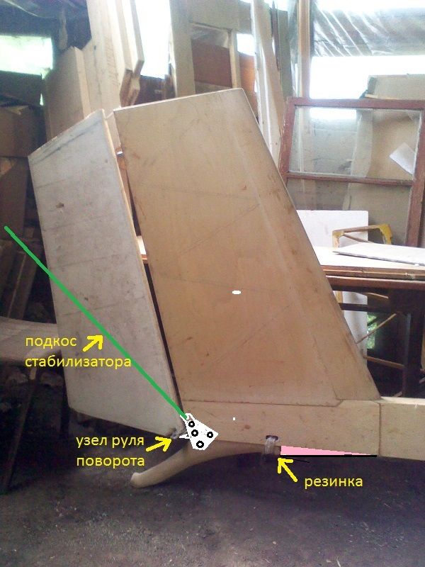 ВП,на костыле резиновый шнур ,сейчас намотана верёвка,которым можно регулировать усилие,да и полёты только  с грунтовки ,колесо не предусматривается.Перед костылём прилажу  треугольный брусочек  отсекатель, чтоб при растяжении резинки костыль не собирал ветки и траву.
