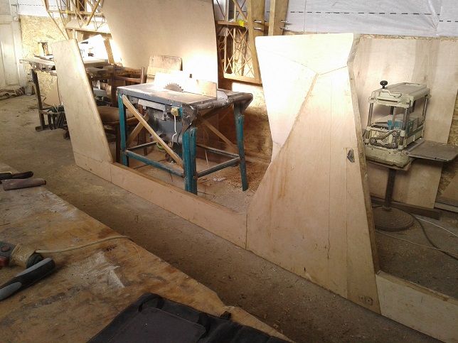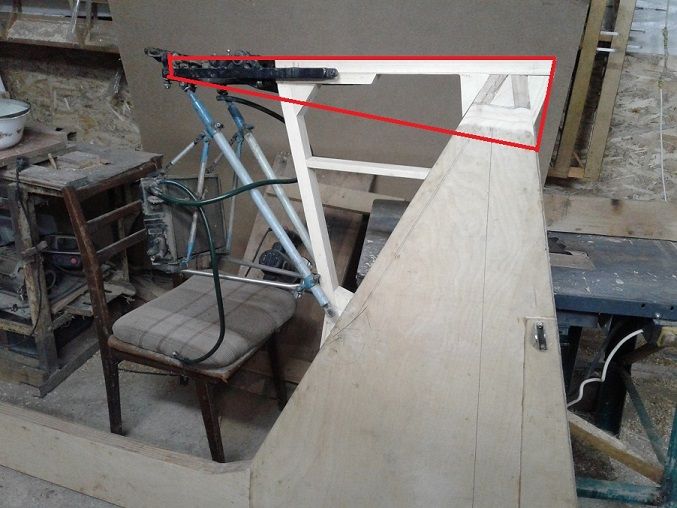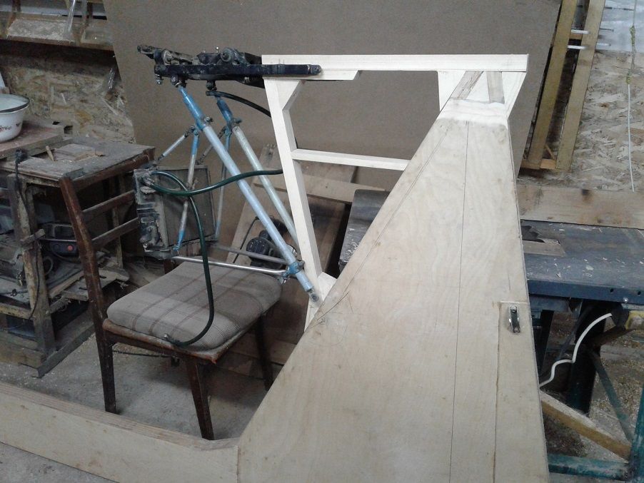 Все куски фанеры склеины на ус. Сверху поверх первого слоя фанеры наклеена усиленная накладка,под мотораму и под передний узел крыла. Так же наклеивается накладка под подкос моторамы в нижнем углу наклееного треугольника. Следующий этап это сидушка и посты управления ,рус и педали. Параллельно моторама... и стаб.....