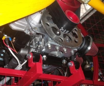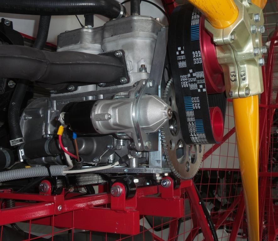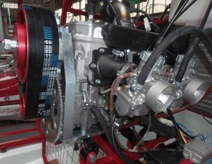 Для пробы решили не заморачиваться с шестеренчатым редуктором и приобрели поликлиновой ременный редуктор 1:2,6  Е. Слепкина из Мелитополя. Он рекомендовался как универсальный для линейки моторов РМЗ 500-550-551. Для установки редуктора требовалось выполнить точные резьбовые отверстия в картере, который нам трогать было запрещено. Кроме того, поскольку у мотора жидкостное охлаждение, сбоку картера появился патрубок водяной помпы, в который упирался стартер и не давал поставить редуктор. Плюс о всему ведомый шкив вращался очень туго – там явно что-то мешало… Вскрытие показало, что подмято уплотнение внутреннего подшипника. Постепенно пришло понимание того, что редуктор придется переделать, причем при крайнем дефиците времени и технологической ограниченности чисто сборочного производства.