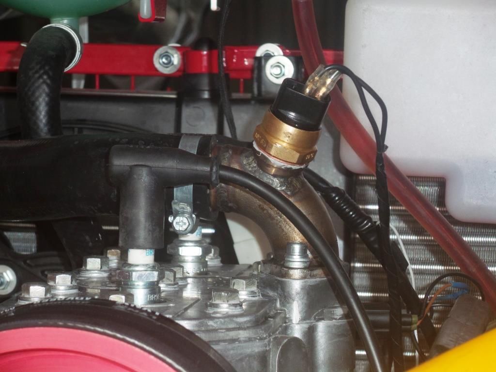 При использовании обычного радиатора от ВАЗ 2108, мы получили рассогласование температуры срабатывания термостата и датчика ТМ 108 включения вентилятора, поэтому датчик с радиатора перенесли на самодельный патрубок выхода антифриза из головки.