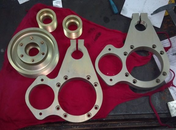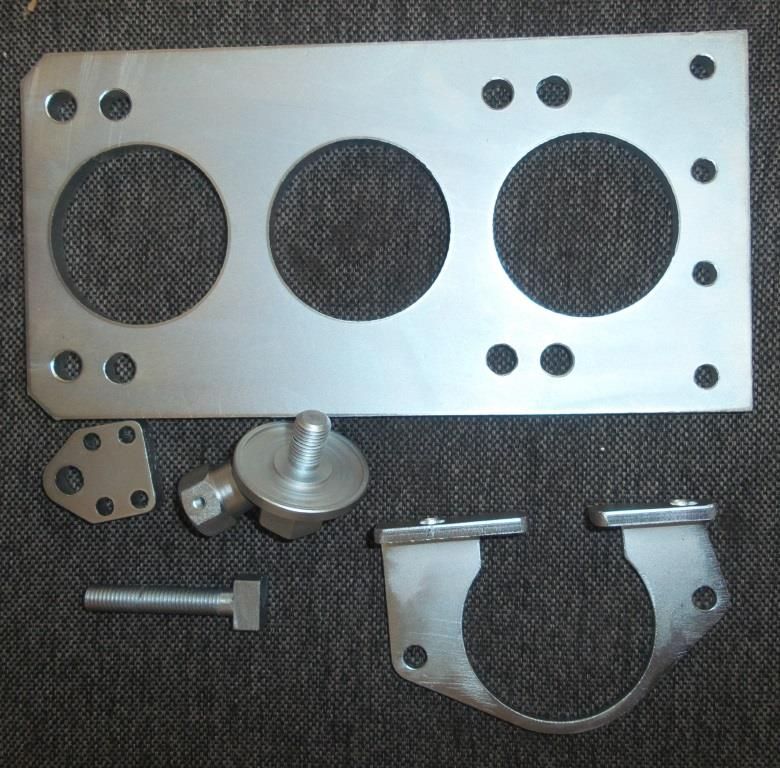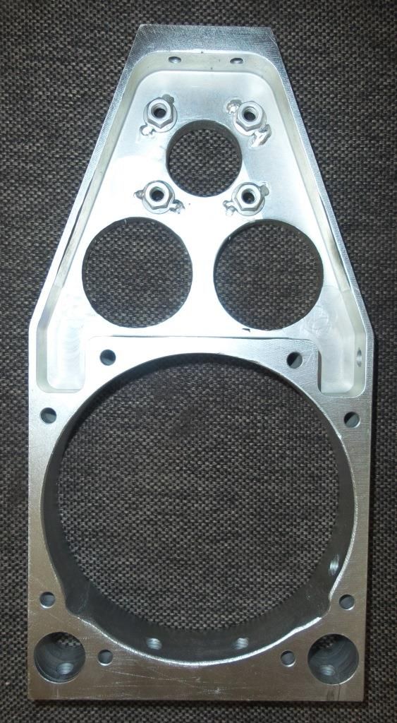 Поскольку для аэролодки вес не столь критичен, как для самолета, решено было сделать корпусные детали не из дорогого дюраля, а из обычной Ст.20, т.к. разница в весе получалась в пределах 1,5кг, а шкивы использовать от редуктора Слепкина, благо они сделаны очень качественно. Чтобы не портить картер сверлениями, редуктор выполнили из двух перпендикулярных плит. Нижняя крепилась к картеру через крепежные шпильки мотора, а вертикальная с верхним валом и натяжителем – к ней на болтах. Такая конструкция, кроме сохранения мотора от переделки, еще и укрепляет картер, как это рекомендуется для Хиртов и Ротаксов – нижняя плита берет на себя часть нагрузки. Стартер пришлось поднять по дуге делительной окружности на 8® и поставить на фланец штуцера помпы один винт с более низкой головкой.