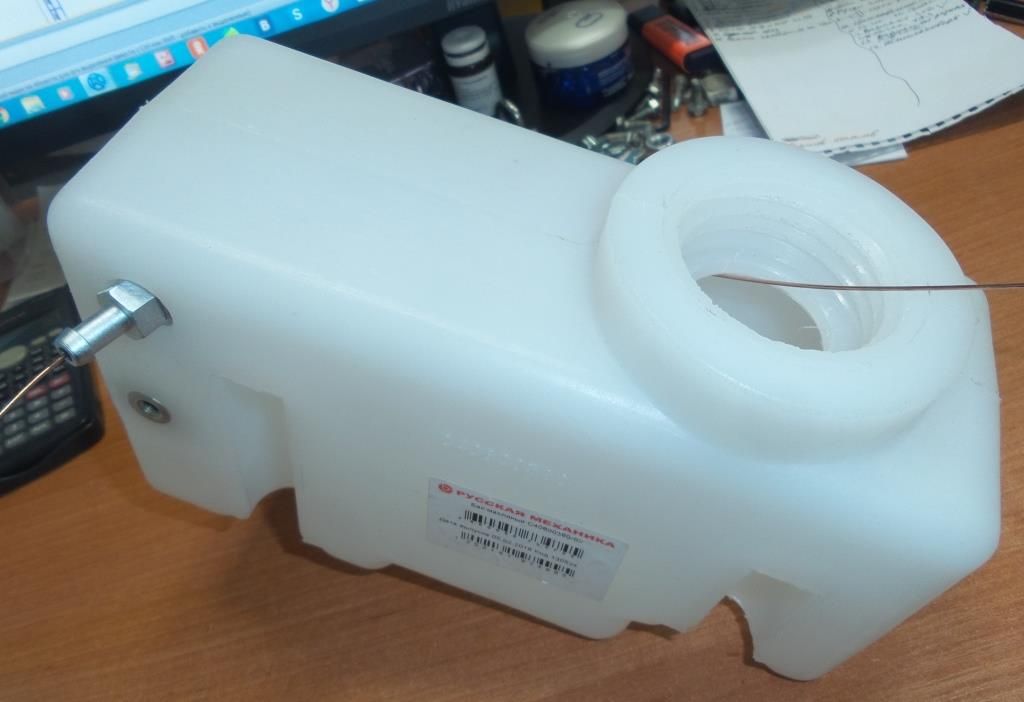 В оригинальной конструкции использована пробка с клапаном от автомобиля ВАЗ 2109. Соответственно для Вашей конструкции можно либо приобрести оригинальный бачок от Русской механики, либо использовать бачок в сборе от автомобиля ВАЗ.