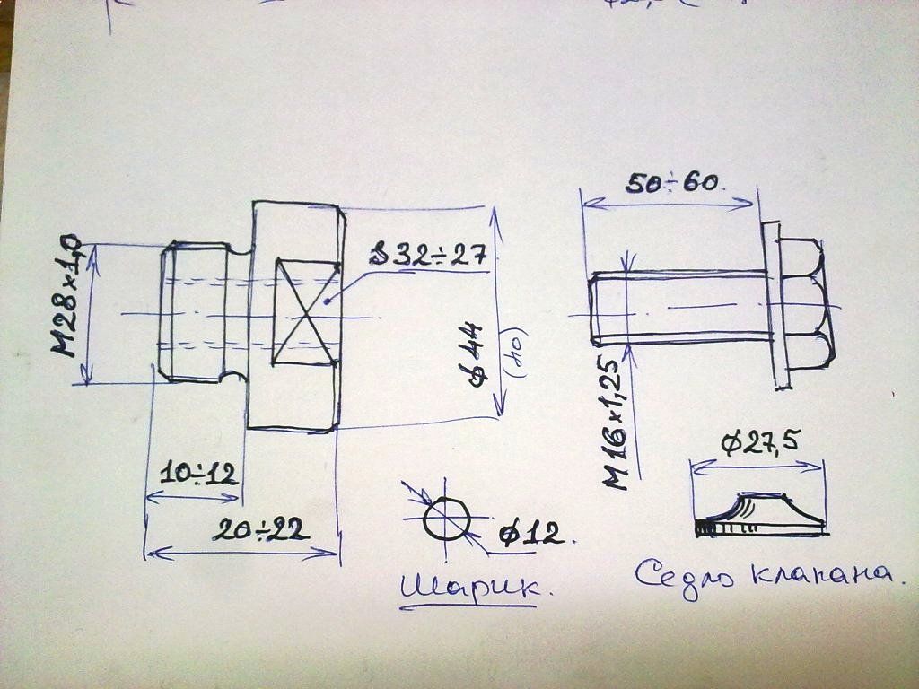 Дополнительно к стандартному болту М16х1,25 класса 8.8 применяется  шарик от подшипника Ф12 - 13 мм и обточенное до [highlight]Ф27,5[/highlight] *(исправить на Ф26 мм) седло клапана (в качестве шайбы - вкладки). Или шляпка мебельного бола М10