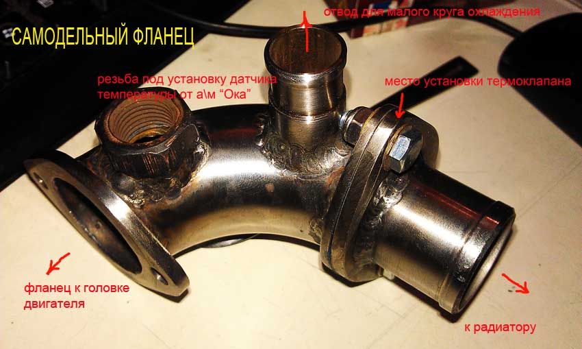 Ниже показана схема организации охлаждения и на фото самодельный фланец, устанавливающийся на головку двигателя