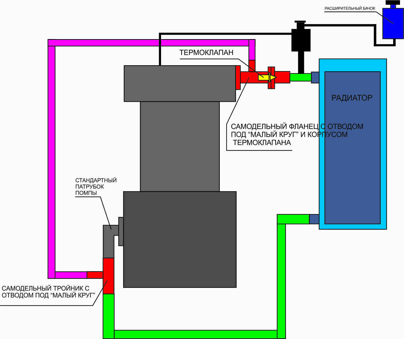 Сверление отверстия в самом термостате , по моему, тоже решит проблему своевременного открытия термостата, но мотор будет дольше прогреваться . И всёже с малым кругом система будет работать более стабильно.