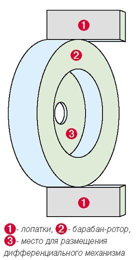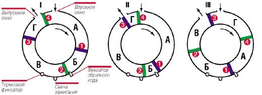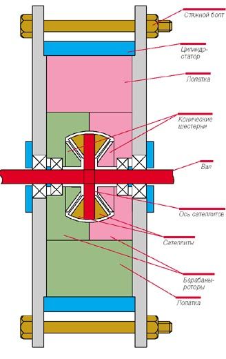Поскольку в качестве устройства отбора мощности используется планетарная передача (сумматор, пост 2) только вал отбора мощности движется по инерции, а не роторы (они двигаются по очереди). Инерция движения ВОМ передаётся с одного ротора на другой через сателлиты, потому один из роторов может легко останавливаться в м.т.12. И два ротора одновременно никогда не фиксируются, потому что тогда действительно, сила инерции через сателлиты поломает двигатель.