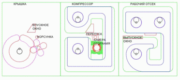 ДВС с разделенным циклом: компрессор всасывает и сжимает воздух, а рабочий отсек, поршень которого насажен на те же валы с эксцентриками, что и поршень компрессора, совершает работу и выталкивает отработанные газы. Третий вал с эксцентриком для синхронизации  основных. Впрыск топлива форсункой в камеру сгорания, расположенную в канале в перегородке после крана, чтоб смазка в кране не выгорала.